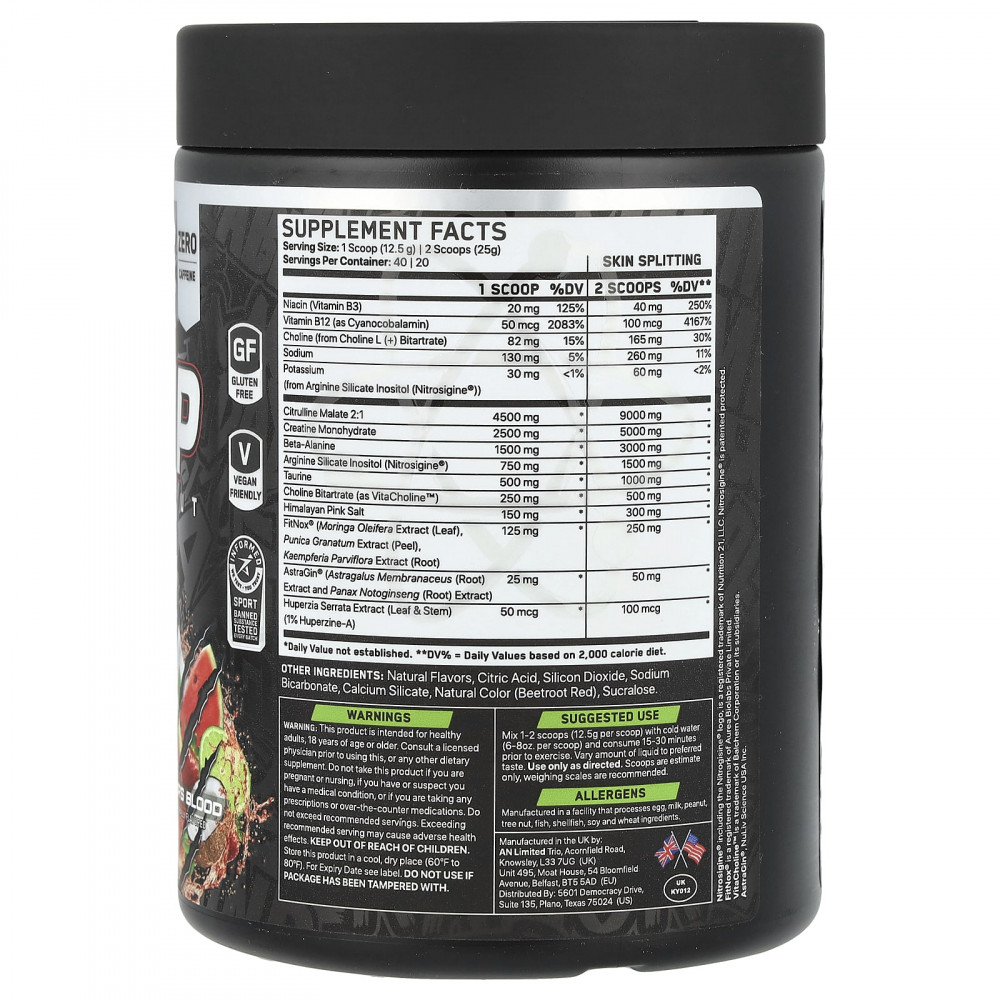 Смешайте 1–2 мерные ложки (12,5 г на мерную ложку) с холодной водой (6–8 унций на мерную ложку) и употребляйте за 15–30 минут до тренировки. Меняйте количество жидкости по вкусу. Применять только согласно инструкции. Лопатки предназначены только для оценки, рекомендуются весы.