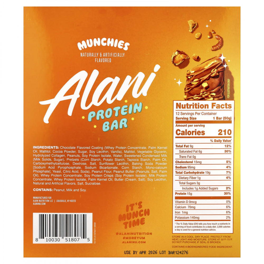 Наши протеиновые батончики Munchies alani с соленым арахисом, карамелью, шоколадом, крендельками и ирисом утолят ваш голод! Насыщенный жевательным липким вкусом, получите незабываемые ощущения: 15 г белка, 3 г сахара и всего 210 калорий.