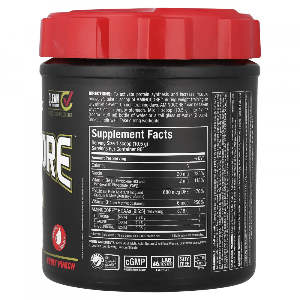 Зачем использовать Allmax AMINOCORE? Не все BCAA одинаковы. AMINOCORE содержит 8,18 г BCAA в соотношении 9:6:5, которое, как клинически доказано, обеспечивает увеличение активации сигналов роста мышц на 350%! AMINOCORE — самый чистый источник BCAA в свободной форме, без наполнителей или аминокислот, не относящихся к BCAA. BCAA AMINOCORE 9:6:5 на 100% чисты до начала ароматизации. Обычные источники с содержанием 2:1:1 включают примеси, приводящие к помутнению, маслянистой пене, осадку и, что еще хуже, неприятному горькому вкусу! AMINOCORE — это самая чистая и вкусная добавка с BCAA, которую можно купить за деньги!
