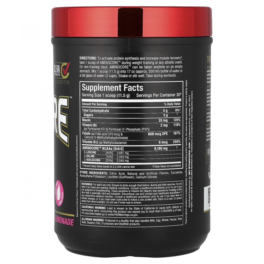Зачем использовать ALLMAX AMINOCORE? - Не все BCAA одинаковы. AMINOCORE содержит 8,18 г BCAA в клинически доказанном соотношении 9:6:5, чтобы обеспечить увеличение активации сигналов роста мышц на 350%. Благодаря использованию чистого источника BCAA в свободной форме AMINOCORE не содержит добавленных наполнителей или аминокислот, не содержащих BCAA. BCAA AMINOCORE 9:6:5 очищаются и тестируются перед добавлением ароматизаторов, поэтому они не содержат примесей, приводящих к помутнению, пене масла, осадку и, что еще хуже, неприятному горькому вкусу! Aminocore - это чистая и лучшая добавка с BCAA, которую можно купить за деньги!
