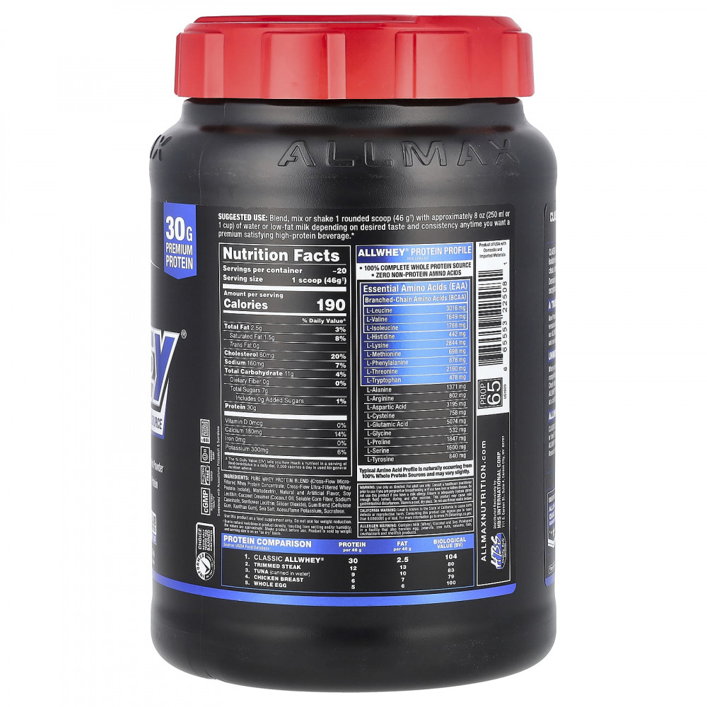 Classic AllWhey® — это концентрат сывороточного протеина премиального качества, смешанный с изолятом сывороточного протеина, гарантировано содержащий 30 г протеина в порции весом 46 г! AllWhey содержит чистый, полноценный и цельный белок из лучших источников — 100% сывороточный протеин!