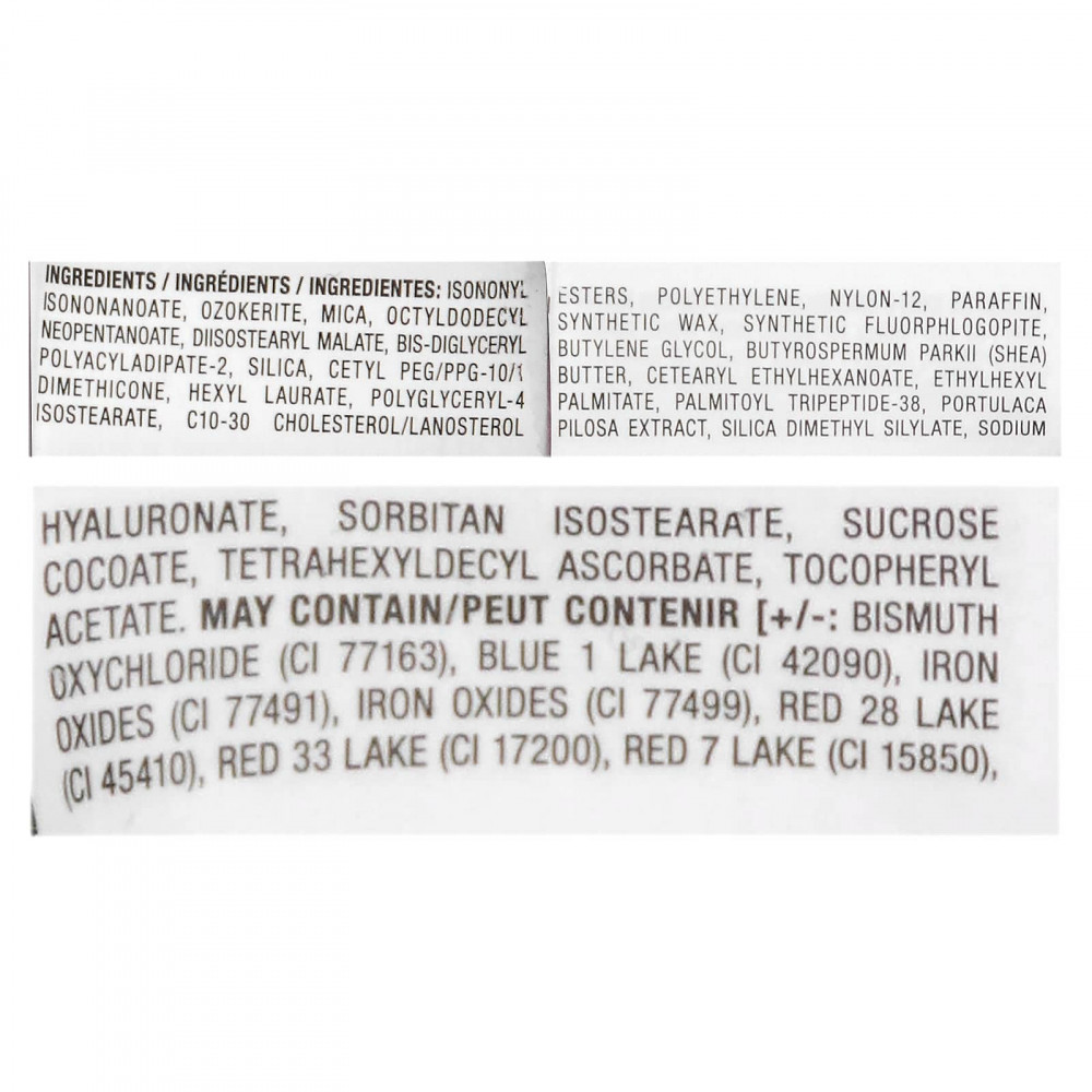изононил изононаноат, озокерит, слюда, октилдодецил неопентаноат, диизостеарил малат, бис-диглицерил полиациладипат-2, диоксид кремния, цетил ПЭГ/ППГ-10/1 диметикон, гексил лаурат, полиглицерил-4 изостеарат, эфиры холестерина/ланостерола c10-30, полиэтилен, нейлон-12, парафина, синтетический воск, синтетический фторфлогопит, бутиленгликоль, масло ши (Butyrospermum parkii), цетеариловый этилгексаноат, этилгексил пальмитат, пальмитоил трипептид-38, экстракт портулака волосистого (Portulaca pilosa), диметил силилат диоксида кремния, гиалуронат натрия, сорбитан изостеарат, кокоат сахарозы, тетрагексилдецил аскорбат, токоферилацетат. Может содержать [+/-: оксихлорид висмута (CI 77163), краситель синий 1 лак (CI 42090), оксиды железа (CI 77491), оксиды железа (CI 77499), краситель красный 28 лак (CI 45410), краситель красный 33 лак (CI 17200), краситель красный 7 лак (CI 15850), диоксид титана (CI 77891), краситель желтый 5 лак (CI 19140).