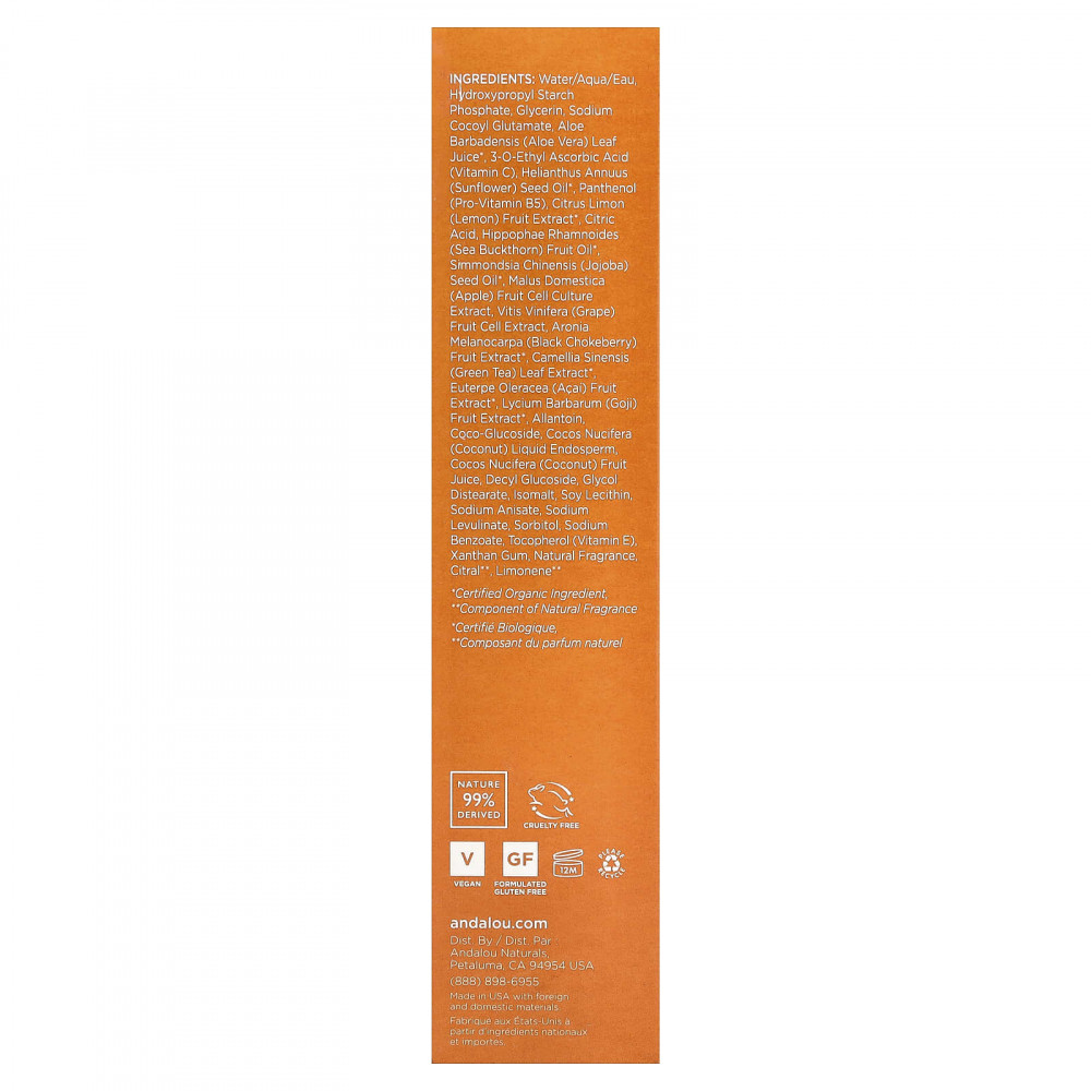 Вода, гидроксипропил фосфат крахмала, глицерин, кокоил глутамат натрия, сок листьев алоэ вера (Aloe barbadensis)*, 3-o-этил-аскорбиновая кислота (витамин C), подсолнечное масло (Helianthus annuus)*, пантенол (провитамин B5), экстракт плодов лимона (Citrus limon)*, лимонная кислота, масло плодов облепихи (Hippophae rhamnoides)*, масло семян жожоба (Simmondsia chinensis)*, экстракт культуры клеток плодов яблони домашней (Malus domestica), экстракт клеток плодов винограда (Vitis vinifera), экстракт плодов аронии (Aronia melanocarpa)*, экстракт листьев зелёного чая (Camellia sinensis)*, экстракт ягод асаи (Euterpe oleracea)*, экстракт ягод годжи (Lycium barbarum)*, аллантоин, кокоглюкозид, жидкий эндосперм кокоса (Cocos nucifera), сок из плодов кокоса (Cocos nucifera), децил глюкозид, гликоль дистеарат, изомальт, соевый лецитин, анисат натрия, левулинат натрия, сорбитол, бензоат натрия, токоферол (витамин E), ксантановая камедь, натуральный ароматизатор, цитраль**, лимонен**.