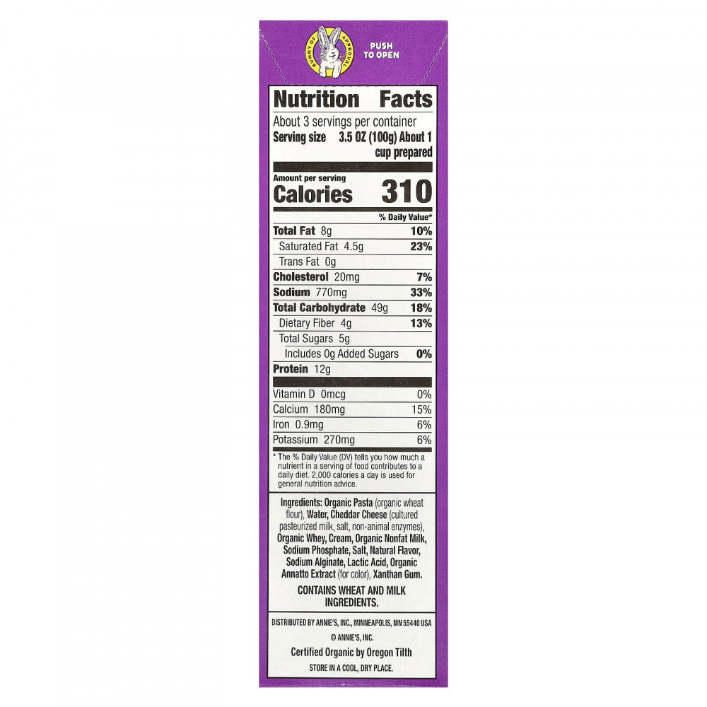«Ракушки Энни», выдержанная паста из чеддера и сырный соус - отличный способ улучшить вкус любимой детской еды. Изготовленный из органических макарон и настоящего сливочного сыра, вы сможете насладиться сырным вкусом этих макарон с сыром. Приготовьте порцию из этой восхитительной пасты с ракушками и сыром как часть детского обеда или ужина, закусок и многого другого! Наслаждайтесь вкусняшкой примерно за 9 минут. Просто приготовьте и слейте воду из пасты, добавьте сырный соус и подавайте в качестве быстрого и вкусного дополнения к блюдам для взрослых или детей. Держите несколько коробок наших макарон с сыром в своей кладовой, чтобы добавить радости в свой день.