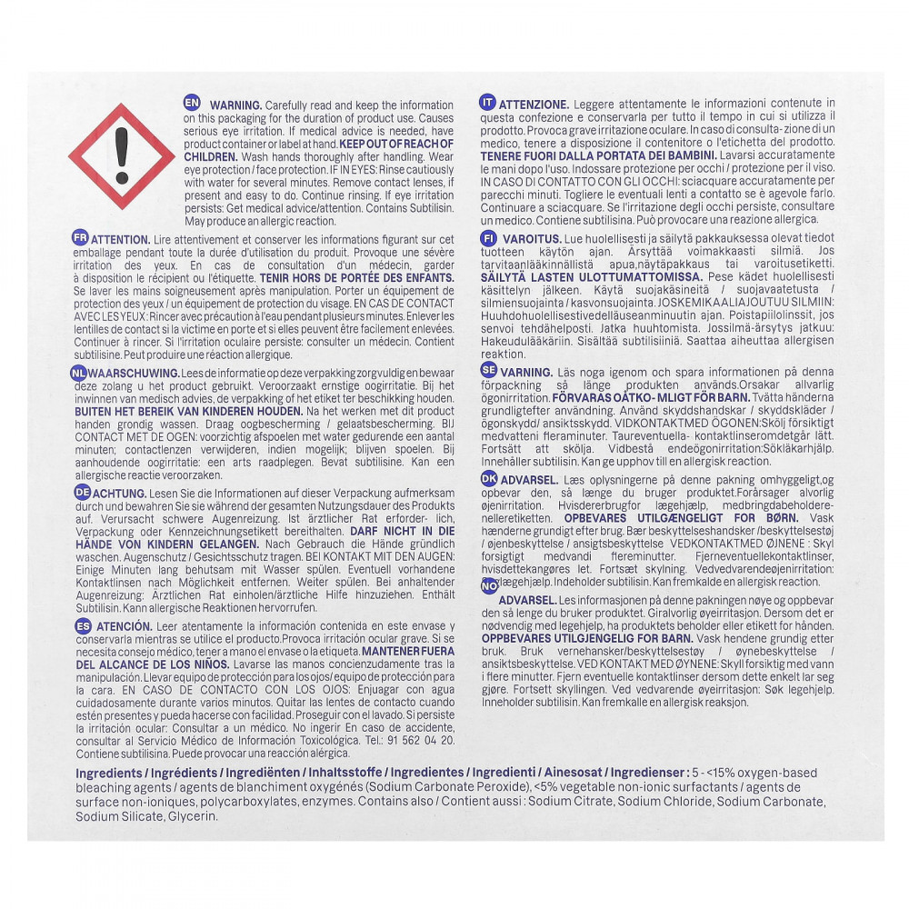 5–15% отбеливающие вещества на основе кислорода (пероксид карбоната натрия), & amp; lt; 5% растительных неионных поверхностно-активных веществ, поликарбоксилаты, ферментов