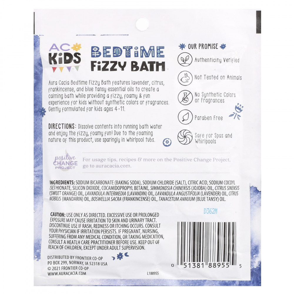 Смесь для ванны с газировкой Aura Cacia содержит эфирные масла лаванды, цитрусовых, ладана и голубой пижмы, которые создают успокаивающую смесь для ванны, обеспечивая шипучий, пенящийся и веселый напиток для детей без синтетических красителей и отдушек. Мягкая формула для детей 4–11 лет.