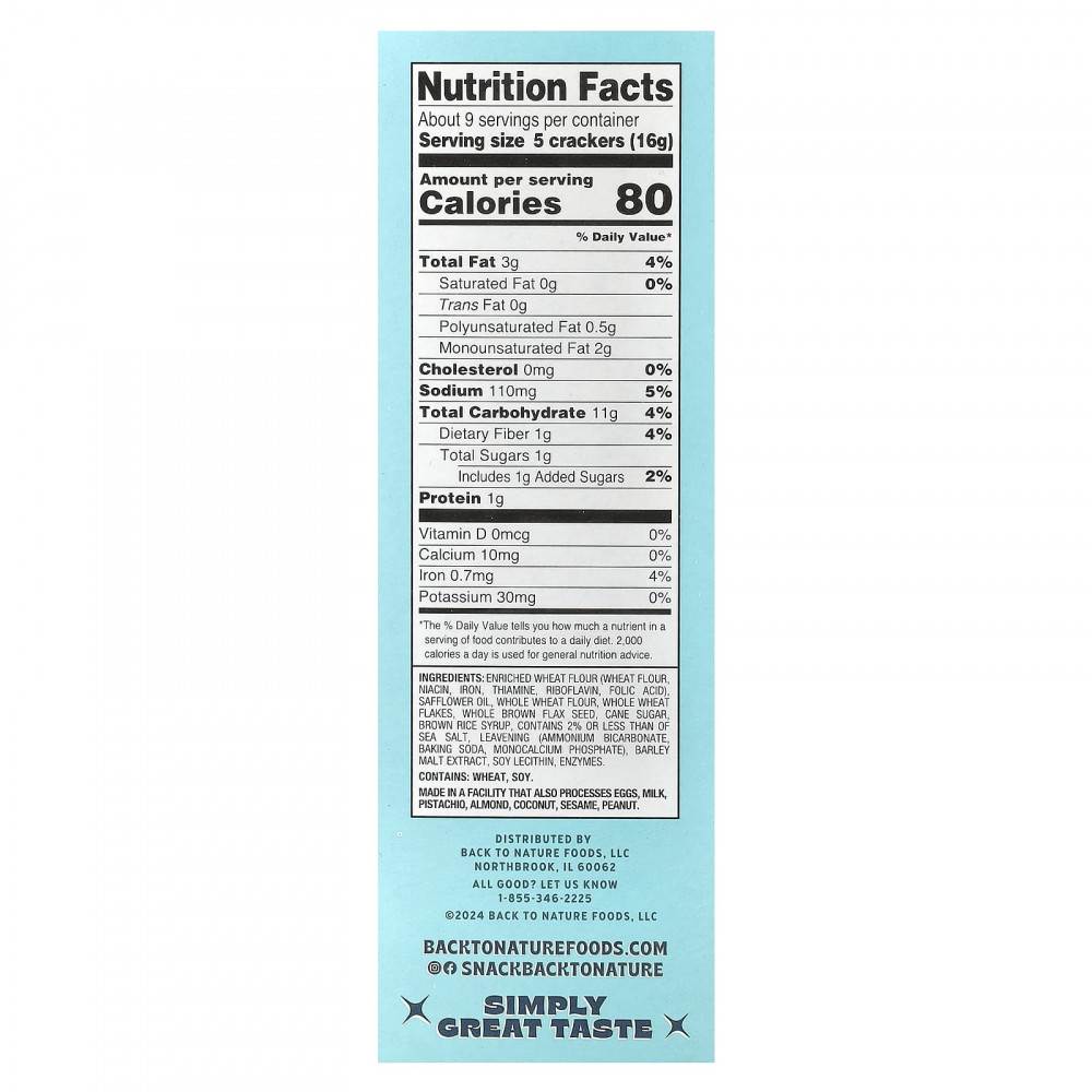 Обогащенная пшеничная мука (пшеничная мука, ниацин, железа, тиамин, рибофлавин, фолиевая кислота), сафлоровое масло, цельнозерновая пшеничная мука, цельнозерновые хлопья, целые семена коричневого льна, тростниковый сахар, сироп из бурого риса, содержит не более 2% морской соли, закваска (бикарбонат аммония, пищевая сода, монокальций фосфат), экстракт ячменного солода, соевый лецитин, ферментов
