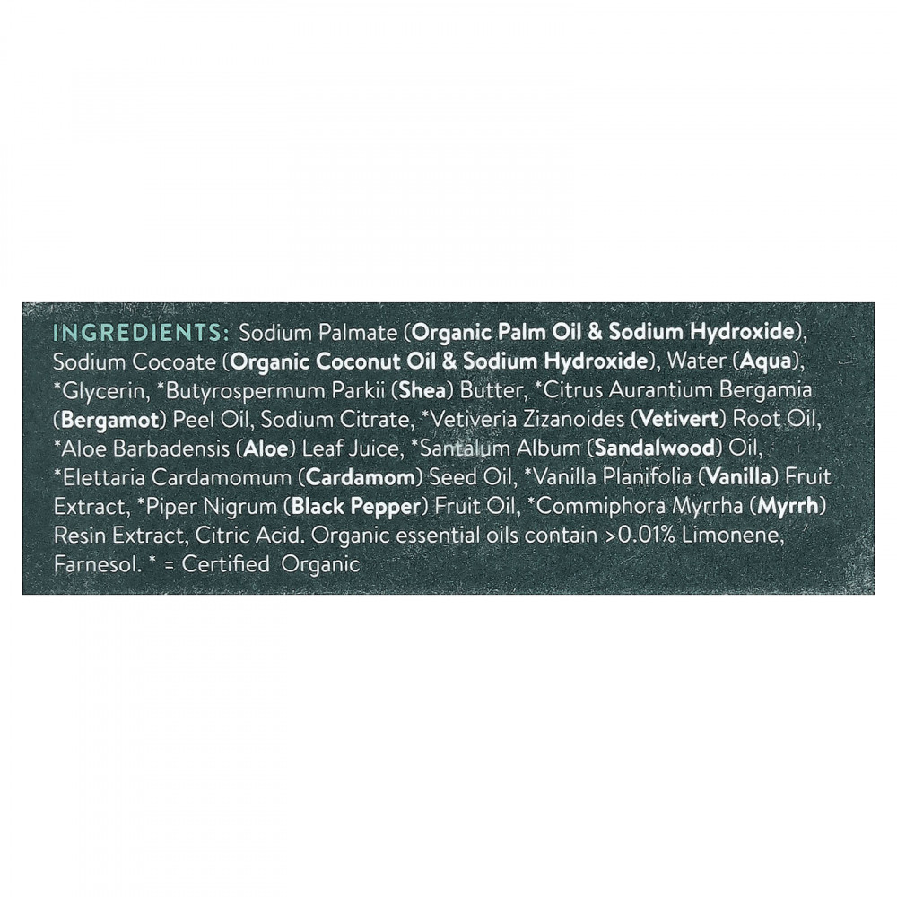 Пальмат натрия (органическое пальмовое масло и гидроксид натрия), кокоат натрия (органическое кокосовое масло и гидроксид натрия), вода (Aqua), глицерин*, масло ши (Butyrospermum parkii)*, масло из цедры плодов бергамота (Aurantium bergamia)*, цитрат натрия, масло из корня ветивера (Vetiveria zizanoides)*, сок листьев алоэ (Aloe barbadensis), * масло сандалового дерева (Santalum album) * масло семян кардамона (Elettaria), экстракт ванили (Vanilla planifolia)*, экстракт плодов перца черного (Piper nigrum)*, экстракт смолы мирры (Commiphora myrrha), эфирные масла содержат & amp; gt; 0,0001% лимонена, линалоол, цитраль, гераниол.