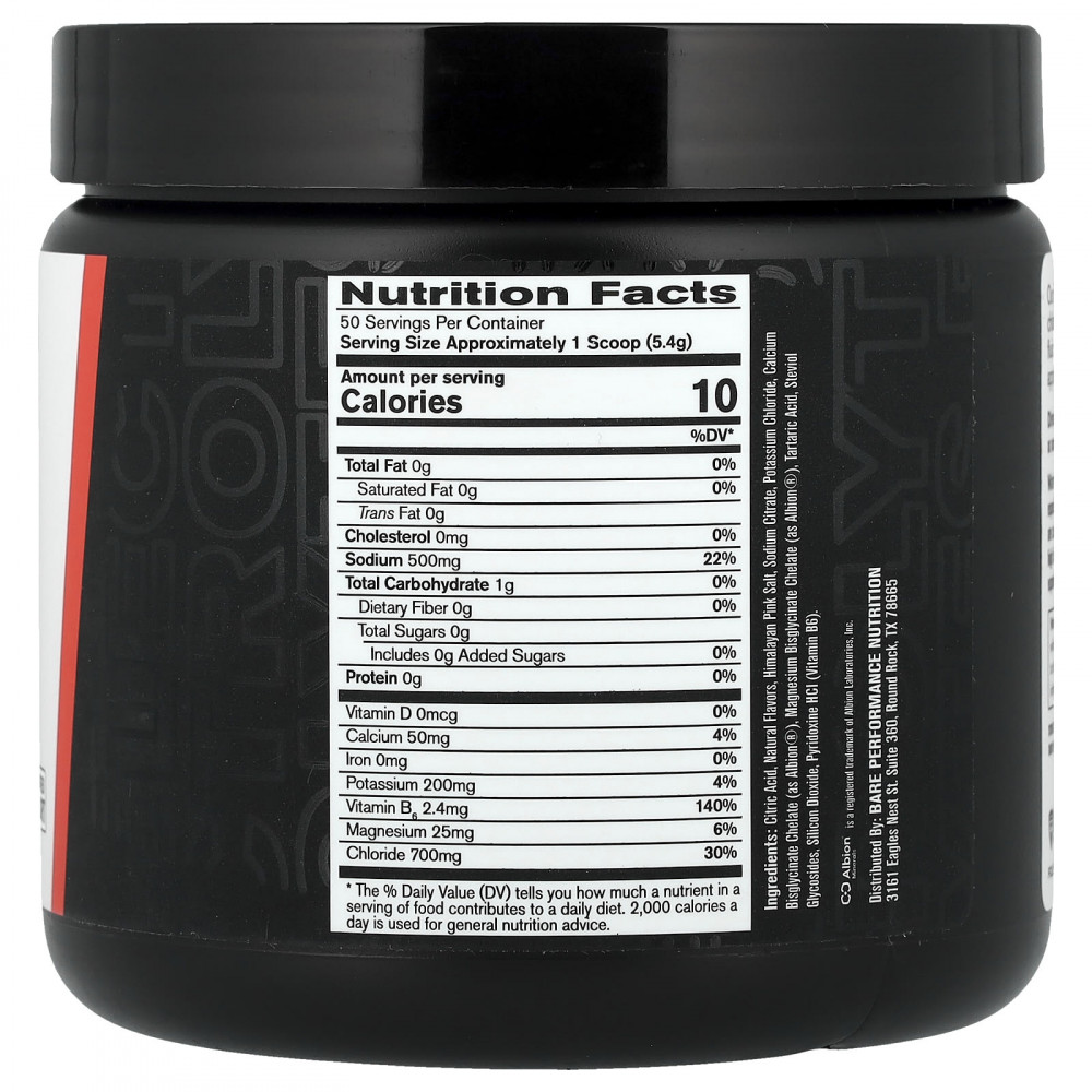 Лимонная кислота, натуральные ароматизаторы, розовая гималайская соль, цитрат натрия, хлорид калия, хелат бисглицината кальция (в виде Albion®, хелат бисглицината магния (в виде Albion®), винная кислота, стевиоловые гликозиды, диоксид кремния., пиридоксин гидрохлорид (витамин B6).