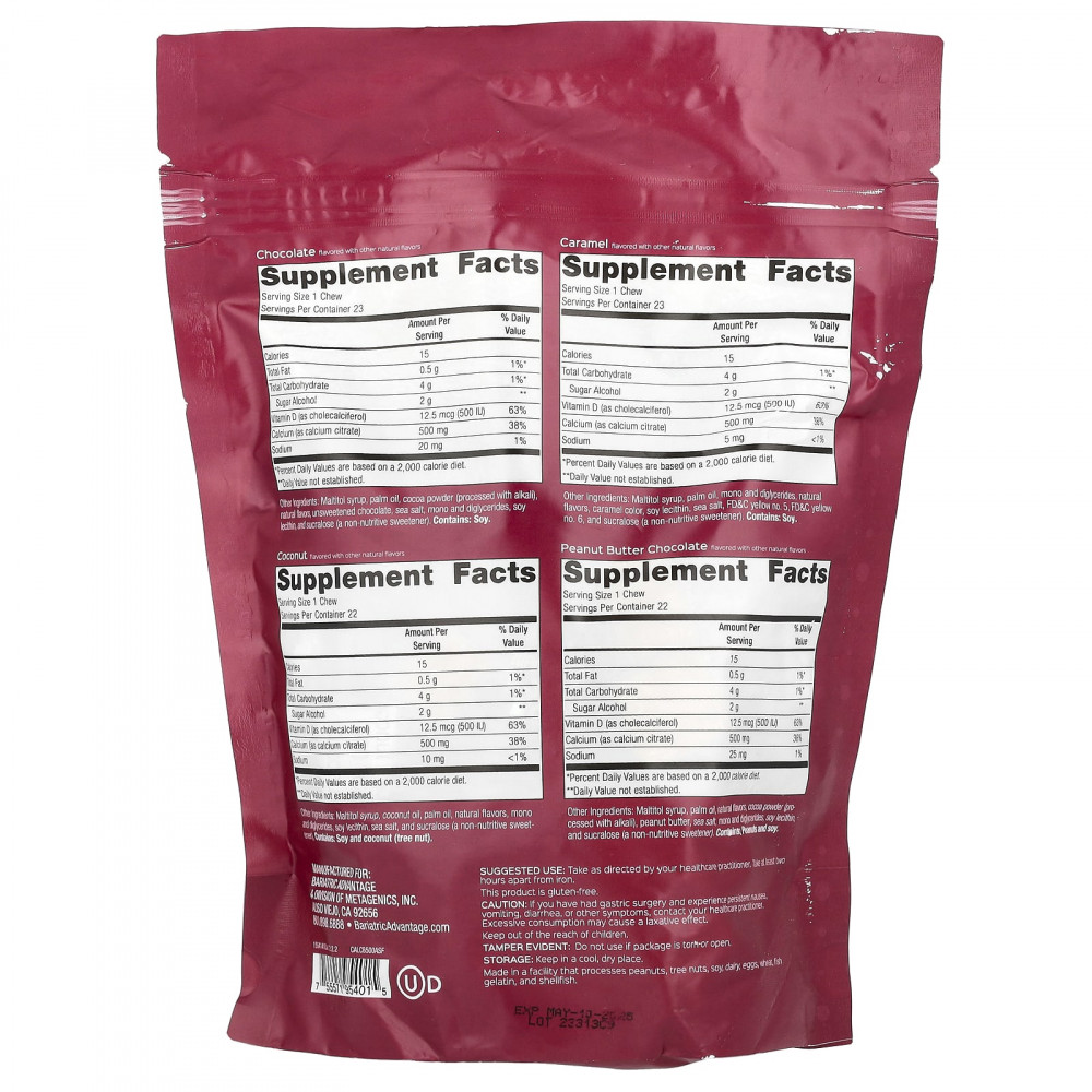 Chewy Bite 500 от Bariatric Advantage® специально разработан для пациентов с нарушенным метаболизмом и бариатрией. Рекомендации Американского общества метаболической и бариатрической хирургии (ASMBS) требуют 1200–1500 мг кальция в день для большинства метаболических и бариатрических пациентов, за исключением пациентов с билиопанкреатическим отводом с дуоденальным переключением (BPD-DS), для которых рекомендация составляет 1800–2400 мг в день.