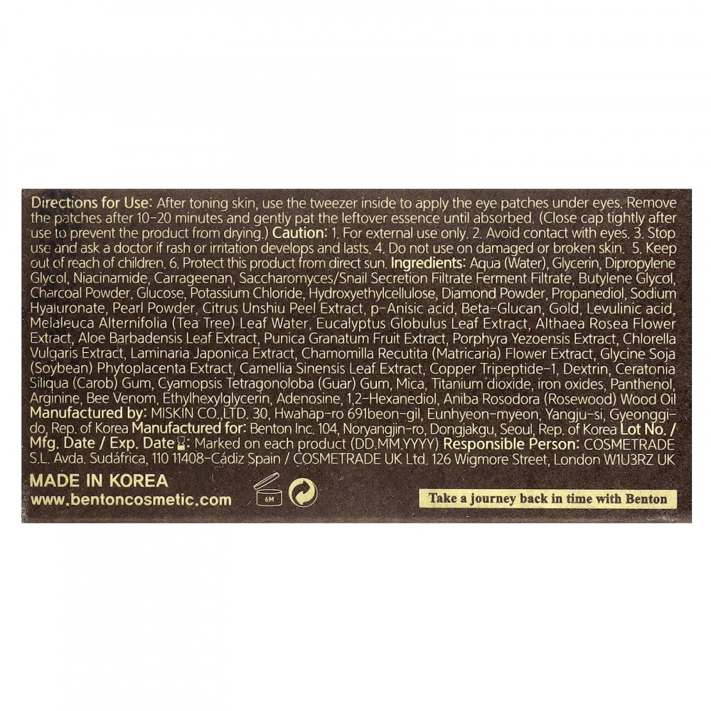 Вода (Aqua), глицерин, дипропиленгликоль, никотинамид, каррагинан, ферментированный фильтрат сахаромицетов/секреции улиток, бутиленгликоль, порошок из древесного угля, глюкоза, хлорид калия, гидроксиэтилцеллюлоза, алмазный порошок, пропандиол, гиалуронат натрия, жемчужный порошок, экстракт цедры мандарина уншиу (Citrus unshiu), п-анисовая кислота, бета-глюкан, золото, левулиновая кислота (Melaleuca alternifolia), вода из листьев чайного дерева, экстракт листьев эвкалипта шаровидного (Eucalyptus globulus), экстракт цветков штокрозы розовой (Althaea rosea), экстракт листьев алоэ вера (Aloe barbadensis), экстракт плодов граната (Punica granatum), экстракт порфиры (Porphyra yezoensis), экстракт хлореллы (Chlorella vulgaris), экстракт ламинарии японской (Laminaria japonica), экстракт цветков ромашки лекарственной (Chamomilla recutita), экстракт фитоплаценты сои (Glycine soja), экстракт листьев зелёного чая (Camellia sinensis), меди трипептид-1, декстрин, камедь рожкового дерева (Ceratonia siliqua), гуаровая камедь (Cyamopsis tetragonoloba), слюда, диоксид титана, оксиды железа, пантенол аргинин, пчелиный яд, этилгексилглицерин, аденозин, 1,2-гександиол, масло для дерева розового дерева (Aniba rosodora).
