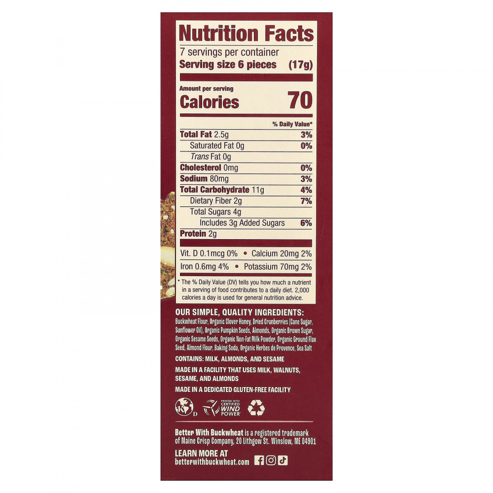 Гречневая мука, органический клеверный мёд, сушеная клюква (тростниковый сахар, подсолнечное масло), органические семена тыквы, миндаль, органический коричневый сахар, органические семена кунжута, органическое сухое обезжиренное молоко, органические молотые семена льна, миндальная мука, Пищевая сода, прованские травы, морская соль.