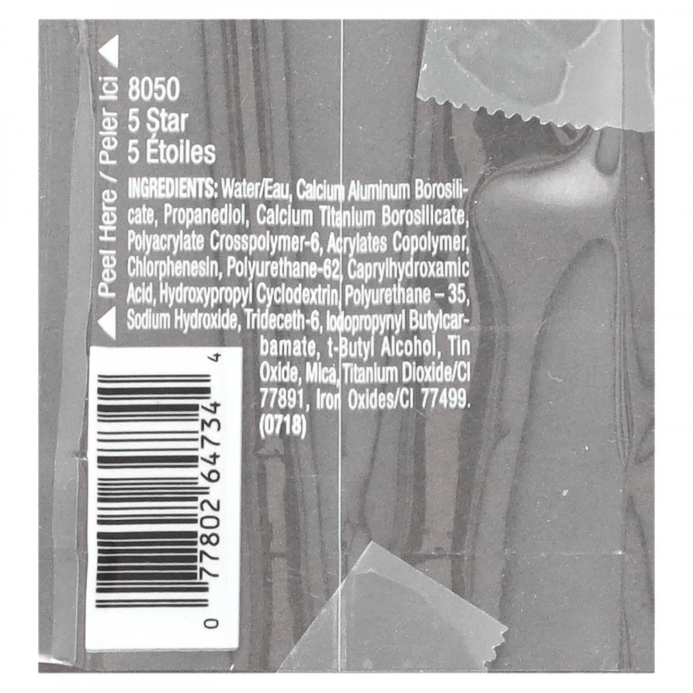 Вода, кальций алюминий боросиликат, пропандиол, боросиликат кальция и титана, полиакрилата кроссполимер-6, сополимер акрилатов, хлорфенезин, полиуретан-62, каприлгидроксаминовая кислота, гидроксипропил циклодекстрин, полиуретан-35, гидроксид натрия, тридецет-6, йодопропинил бутилкарбамат, т-бутиловый спирт, оксид олова, слюда, диоксид титана (CI 77891), оксиды железа (CI 77499).