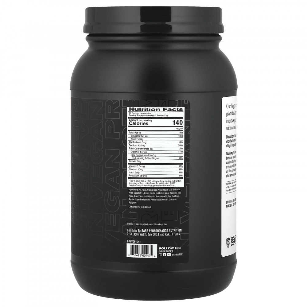 Гороховый протеин, обработанный щёлочью какао-порошок, порошок среднецепочечных триглицеридов (в виде goMCT®), порошок из семян органической тыквы, протеин из семян органического арбуза, натуральный ароматизатор, стевиоловые гликозиды (ребаудиозид М), экстракт архата, смесь пищеварительных ферментов (амилаза, протеаза, липаза, целлюлаза, лактаза) (в виде Digezyme®).