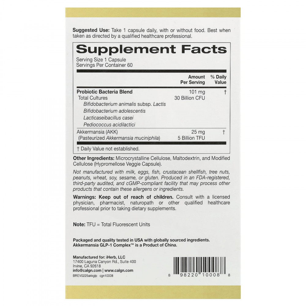 Комплекс Akkermansia GLP-1 Complex™ от California Gold Nutrition® состоит из 4 живых активных штаммов и 1 пастеризованного штамма: аккермансия (Akkermansia muciniphila). Каждая вегетарианская капсула содержит 30 миллиардов КОЕ всех культур и 5 млрд TFU (общее количество флуоресцентных единиц) аккермансии, благодаря чему доставляет эффективное количество полезных бактерий в организм. Исследования показали, что эти бактериальные штаммы способствуют здоровью кишечника и пищеварительной системы, поддерживают метаболизм, общее здоровье организма и хорошее самочувствие*. Содержит отобранные штаммы бактерий, устойчивые к низкому уровню pH и условиям в желудочно-кишечном тракте (например, кислота, желчь, пепсин и панкреатин), а также прикрепляется к клеточным линиям кишечного эпителия.