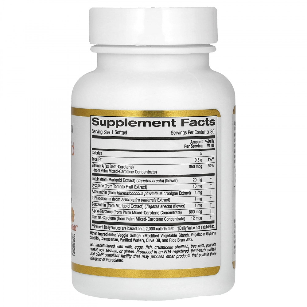 Комплекс AstaCarotenoid от California Gold Nutrition содержит экстракт цветков бархатцев mGold ™ и другие экстракты антиоксидантов премиального качества в форме растительных мягких таблеток. Эта добавка не содержит глютена, ГМО и сои, подходит для вегетарианцев и веганов.
