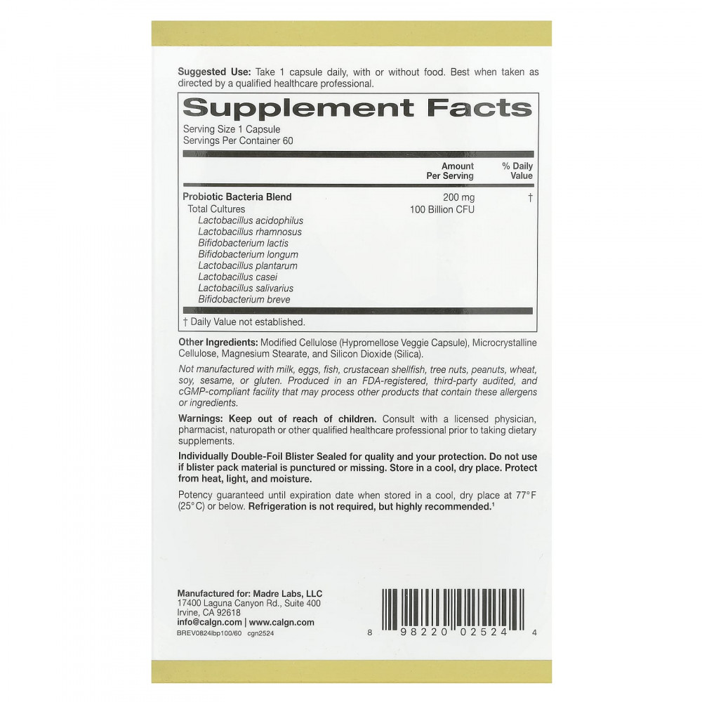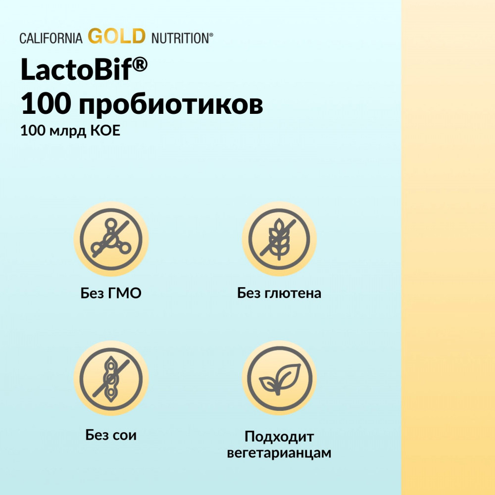 California Gold NutritionLactobif® 100 с пробиотиками содержат 8 активных штаммов пробиотиков², включая 5 лактобактерий и 3 бифидобактерии. Каждая растительная капсула содержит 100 млрд КОЕ, чтобы доставлять в организм эффективное количество полезных бактерий.