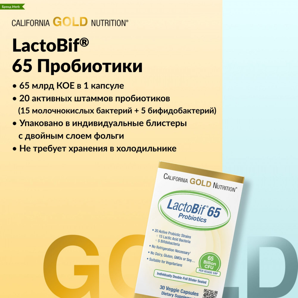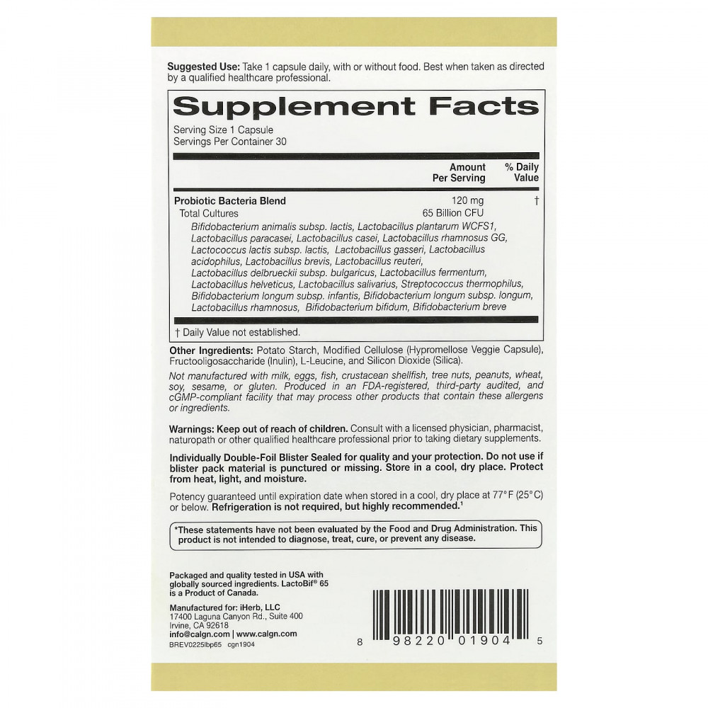 Пробиотики Lactobif® 65 от California Gold Nutrition содержат 20 активных штаммов пробиотиков, в том числе 15 штаммов молочнокислых бактерий и 5 штаммов бифидобактерий. Каждая растительная капсула содержит 65 млрд КОЕ, чтобы доставлять в организм эффективное количество полезных бактерий.