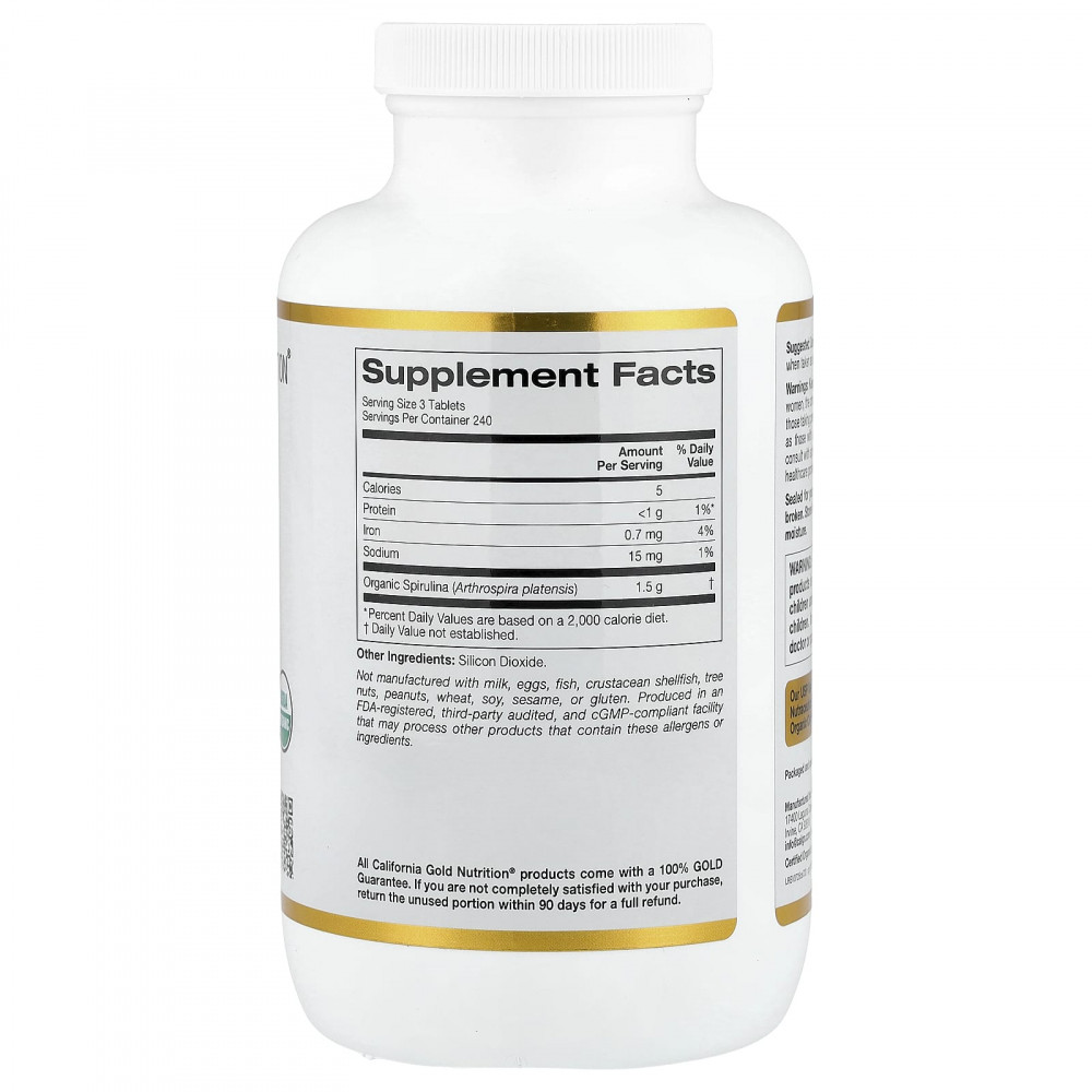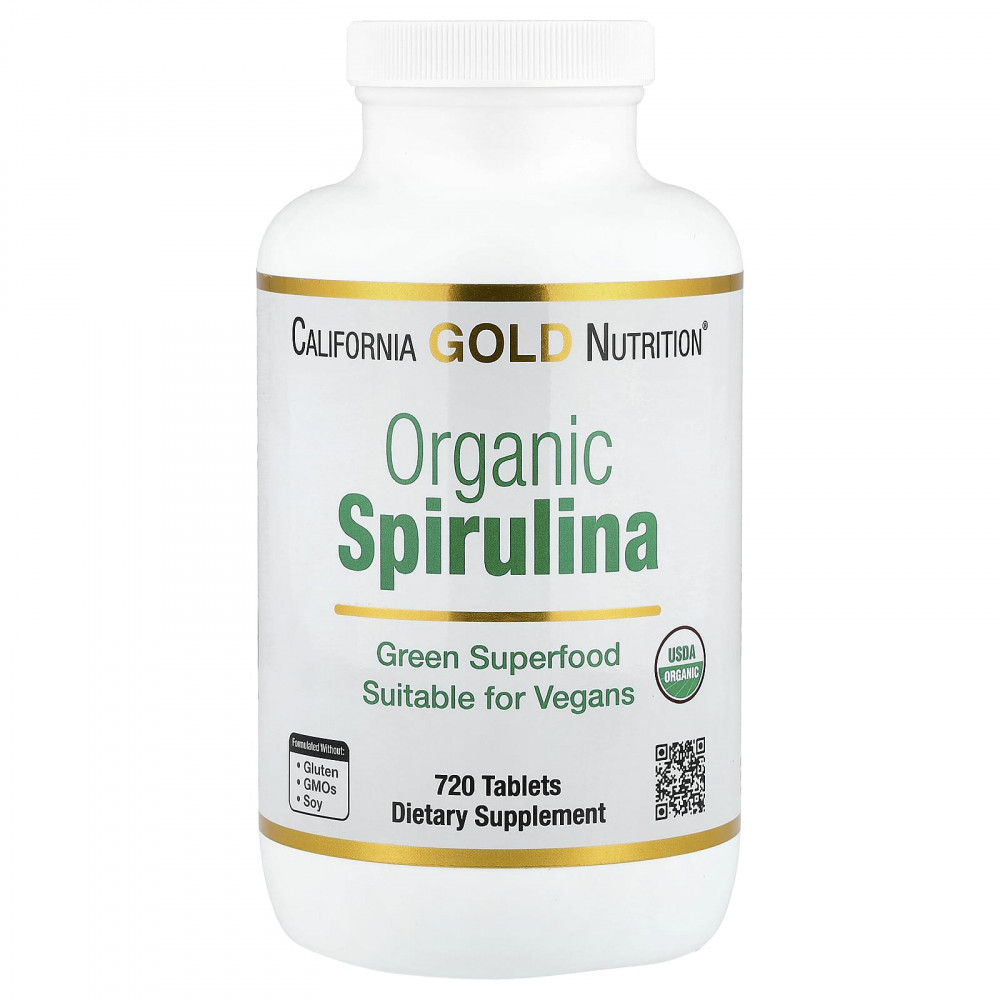 Органическая спирулина от California Gold Nutrition содержит органическую спирулину (Arthrospira platensis) в таблетках. Спирулина в этой одобренной Фармакопеей США (USP) добавке производится компанией Parry Nutraceuticals, лидером в области производства сине-зеленых водорослей. Этот продукт соответствует качественным и количественным требованиям по контролю качества или превосходит их. Одна упаковка рассчитана на прием в течение 240 дней (при соблюдении рекомендованной порции).