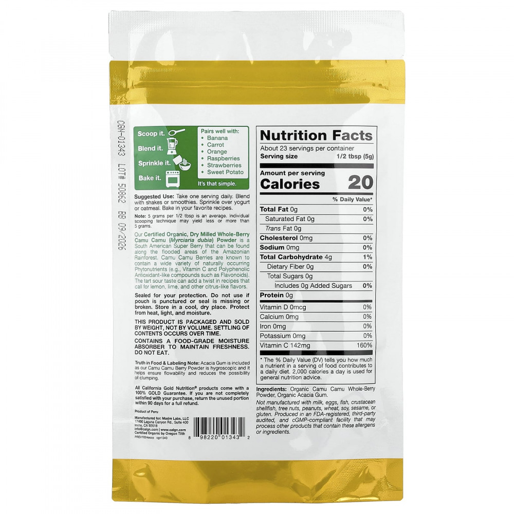 Органический порошок из каму-каму от California Gold Nutrition® Superfoods — это сухой измельченный порошок из цельных ягод растений, выращенных в Перу. Известно, что ягоды каму-каму содержат большое количество природных фитонутриентов, таких как витамин С, и полифенольные соединения с антиоксидантными свойствами, такие как флавоноиды. Терпкий и кисловатый вкус порошка оживит вкус блюд, которые принято приправлять лимоном, лаймом и другими цитрусовыми.