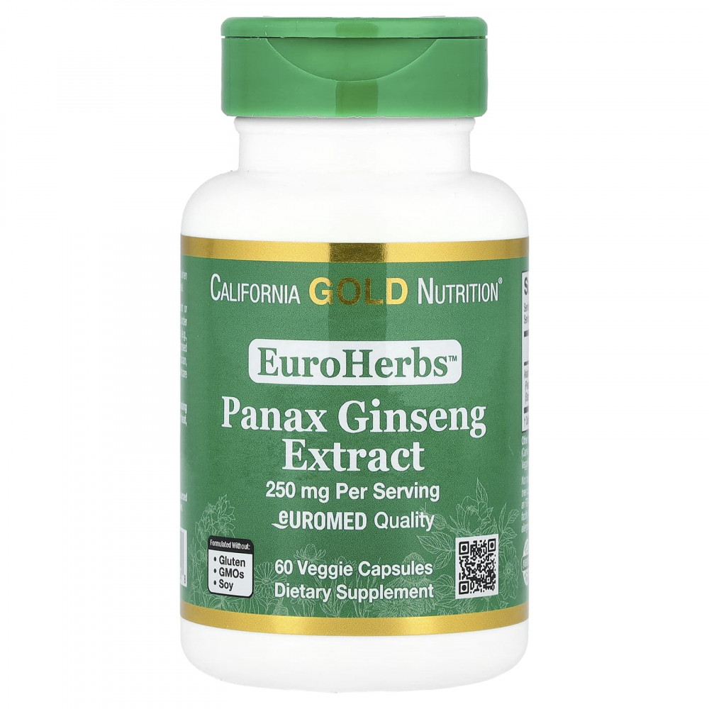 Женьшень обыкновенный (Panax ginseng) от California Gold Nutrition®️ EuroHerbs™ содержит экстракт премиального качества, стандартизированный до 4% гинзенозидов. Зеленые растительные капсулы с красителем природного происхождения изготовлены из хлорофилла, полученного из листьев люцерны и шелковицы.