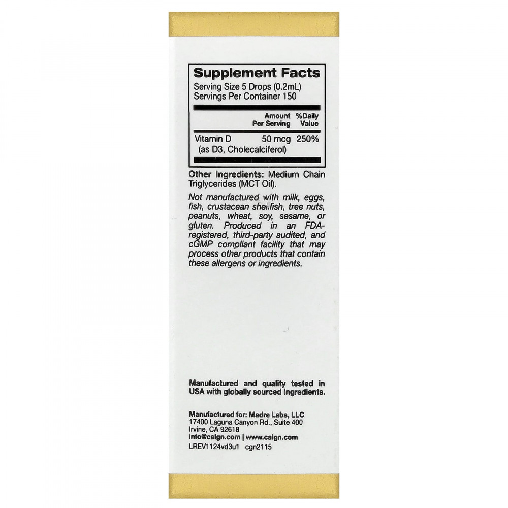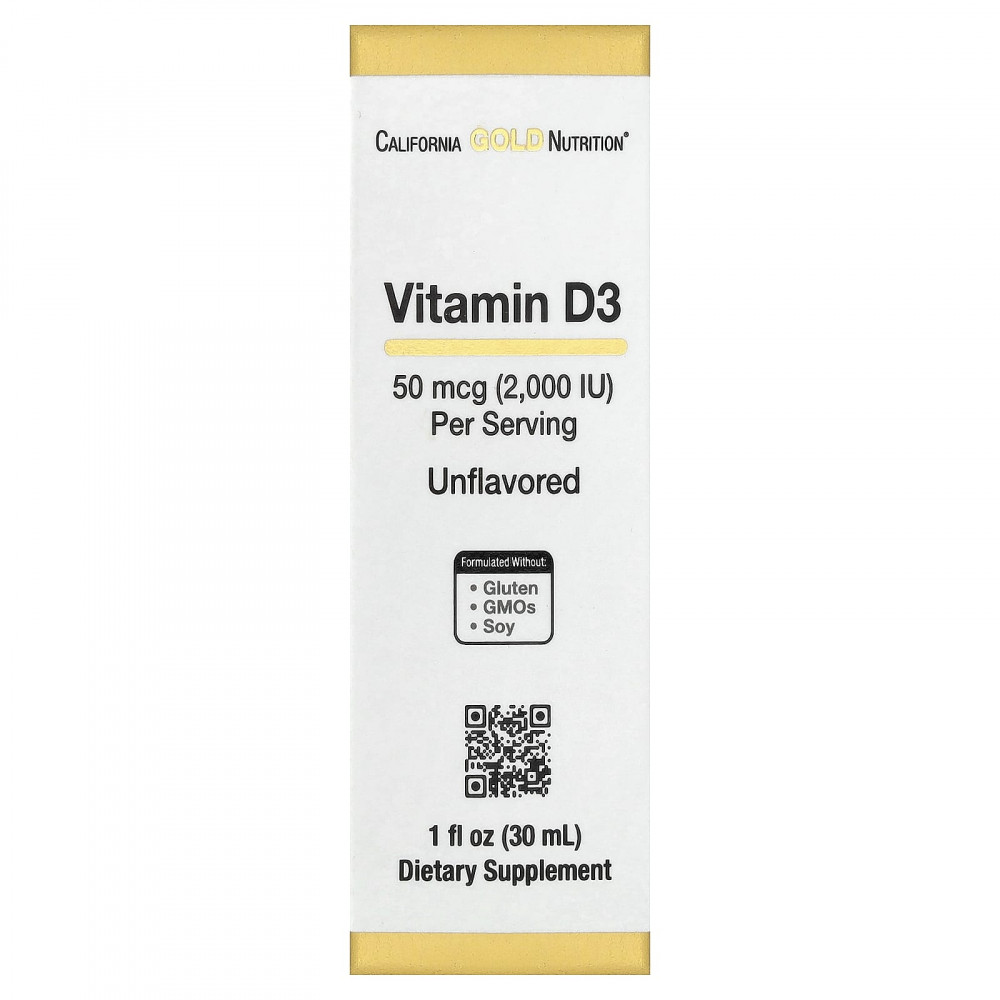 Витамин D3 от California Gold Nutrition содержит витамин D3 (холекальциферол) в виде удобной жидкой добавки. Он имеет нейтральный вкус, благодаря чему прекрасно сочетается с любыми напитками, а также не содержит глютена, ГМО и сои.