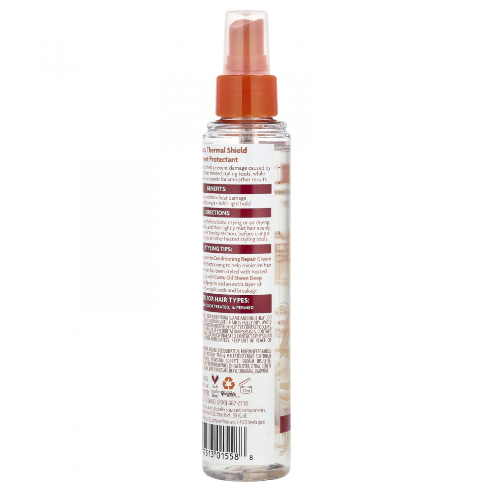 Содержит чистое масло ши, которое восстанавливает жизненно необходимую влагу, делает волосы более сильными и здоровыми и придает им естественный блеск. Термозащитное средство для волос Cantu для нанесения перед укладкой подходит для любой прически, помогает свести к минимуму повреждения от воздействия утюжка и других инструментов для горячей укладки волос, а также увлажняет пряди, устраняя пушение и обеспечивая гладкость волос.