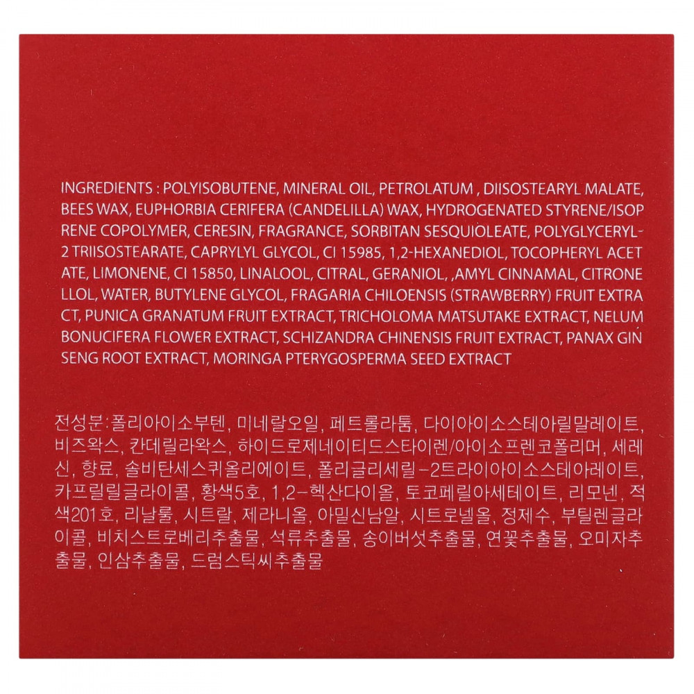 полиизобутен, минеральное масло, вазелин , диизостеарил малат, пчелиный воск, канделильский воск (Euphorbia cerifera), гидрогенизированный изопренстирольный сополимер, церезин, отдушка, сорбитана сесквиолеат, полиглицерил 2 триизостеарат, каприлилгликоль, 1,2-гександиол (CI 15985), токоферил ацетат, лимонен, CI 15850, линалоол, цитраль, гераниола, , амилциннамаль, цитронеллола, вода, бутиленгликоль, экстракт ягод клубники (Fragaria chiloensis), экстракт плодов граната (Punica granatum), экстракт трихоломы мацутаке, экстракт цветков (Nelum bonucifera), экстракт плодов лимонника китайского (Schizandra chinensis), экстракт корня женьшеня (Panax ginseng), экстракт семян моринги масличной (Moringa pterygosperma).