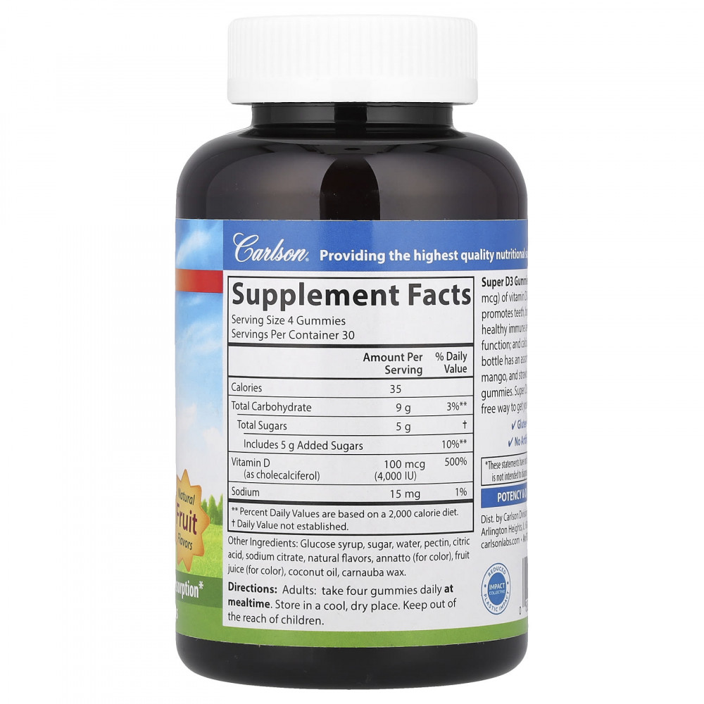 Жевательные мармеладки с витамином D3 содержат 4000 МЕ (100 мкг) витамина D3 в каждой порции, что способствует здоровью зубов, костей и мышц; нормальной функции иммунной и сердечно-сосудистой системы; а также усвоению кальция. В каждой бутылке есть вкусные вегетарианские жевательные мармеладки со вкусом персика, манго и клубники. Жевательные супермармеладки с витамином D3 — это способ без хлопот получать витамин D каждый день.