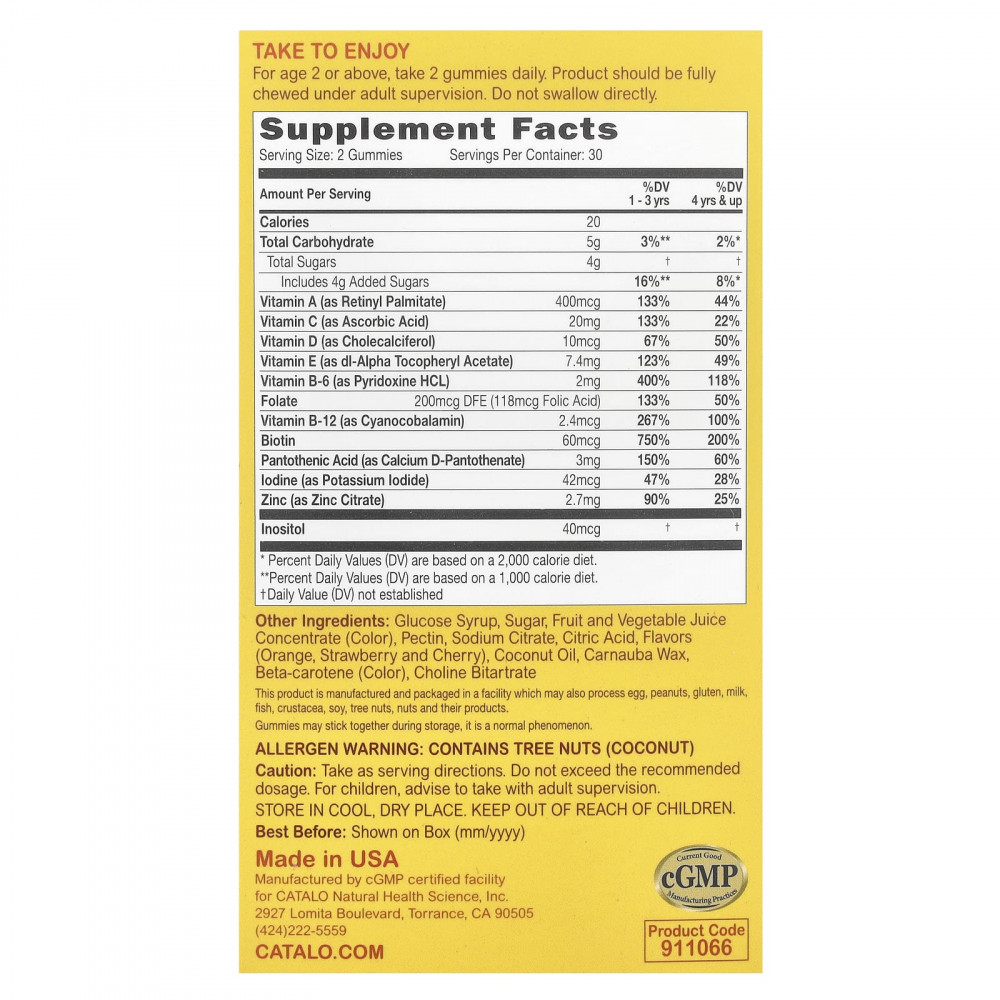 Крахмальная патока, сахара, концентрат фруктового и овощного сока (краситель), пектин, цитрат натрия, лимонная кислота, ароматизаторы (апельсин, клубника и вишня), кокосовое масло, карнаубский воск, бета-каротин (краситель), битартрат холина.