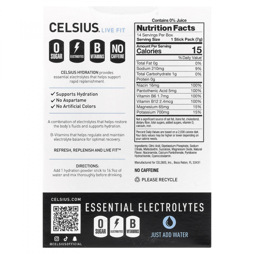 Celsius Hydration обеспечивает организм необходимыми электролитами, которые помогают быстро восполнить его запасы.