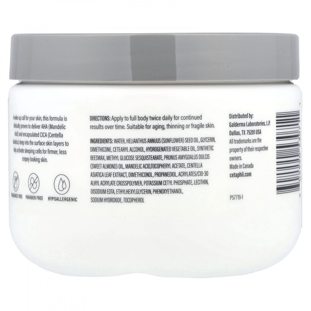 Вода, подсолнечное масло (Helianthus annuus), глицерин, диметикон, цетеариловый спирт, гидрогенизированное растительное масло, синтетический воск, метилглюкозы сесквистеарат, масло сладкого миндаля (Prunus amygdalus dulcis), миндальная кислота, токоферилацетат, экстракт листьев готу колы (Centella asiatica), диметиконол, пропандиол, акрилат/c10-30 алкил акрилат кроссполимер, цетил фосфат калия, лецитин, двунатриевая ЭДТК, этилгексилглицерин, феноксиэтанол, гидроксид натрия, токоферол.
