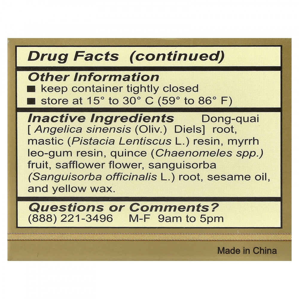 | корень дягиля лекарственного (Angelica sinensis (Oliv.) Diels), смола мастикового дерева (Pistacia lentiscus L.), смола камеди мирры (Myrrh leo-steam), плоды айвы (вида Chaenomeles), цветки сафлора, корень сангвисорбы (Sangusorba officinalis L.), кунжут масло и желтый воск. | |