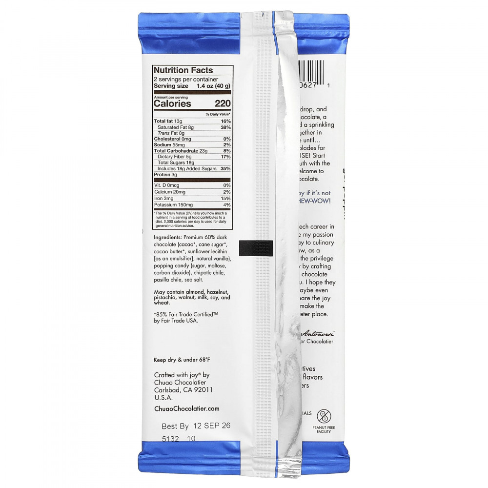 60% темный шоколад премиального качества (какао*, тростниковый сахар*, какао-масло*, подсолнечный лецитин [в качестве эмульгатора], натуральная ваниль), попкорн (сахар, мальтоза, диоксид углерода), чипотле с чили, чили пастилья, морская соль.