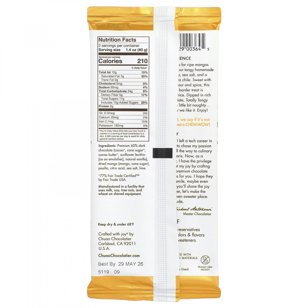 60% темный шоколад премиального качества (какао*, тростниковый сахар*, какао-масло*, подсолнечный лецитин [в качестве эмульгатора], натуральная ваниль), сушеное манго (манго, тростниковый сахар), пасилья, лимонная кислота, морская соль, лайм.