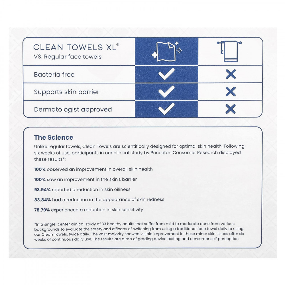В отличие от обычных полотенец, чистые полотенца разработаны для оптимального здоровья кожи. После шести недель использования участники нашего клинического исследования, проведенного Princeton Consumer Research, показали следующие результаты *: