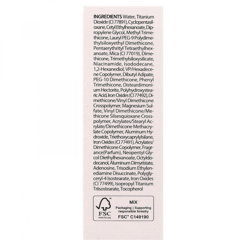 Вода, диоксид титана (CI 77891), циклопентасилоксан, цетилэтилгексаноат, дипропиленгликоль, метилтриметикон, лаурил ПЭГ-9 полидим тилсилоксиэтил диметикон, пентаэритритил тетраэтилгексаноат, слюда (CI 77019), диметикон, триметилсилоксисиликат, никотинамид, изододекан, 1,2-гександиол, ВП/гексадецен сополимер, дибутиладипат, ПЭГ-10 диметикон, фенилтриметикон, дистеардимония гекторит, полигидроксистеариновая кислота, оксиды железа (CI 77492), диметикон / винилдиметикон кроссполимер, сульфат магния, винил диметикон/метикон силсесквиоксан кроссполимер, акрилаты/стеарил акрилат/диметикон метакрилат сополимер, гидроксид алюминия, триэтоксикаприлилсилан, оксиды железа (CI 77491), сополимер акрилатов / диметикона, отдушка (парфюмерная композиция), неопентилгликоль диэтилгексаноат, октилдодеканол, димиристат алюминия, аденозин, тринатрия этилендиамин дисукцинат, полиглицерил-4 изостеарат, оксиды железа (CI 77499), изопропиловый триизостеарат титана, токоферол.