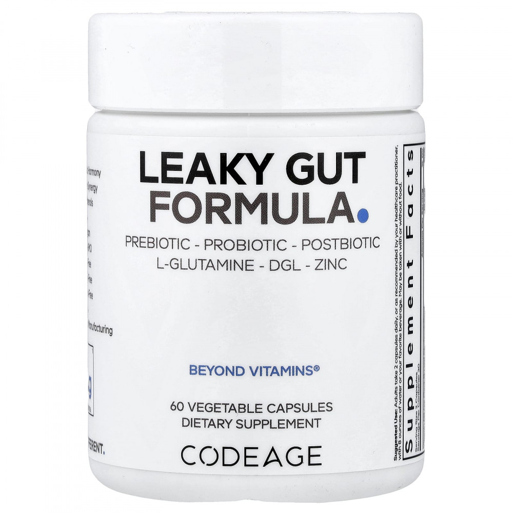 Добавка для облегчения симптомов синдрома раздражённого кишечника Codeage содержит набор ингредиентов, таких как L-глютамин и витамин D, полученные из холекальциферола, а также L-карнозин с цинком, N-ацетилглюкозамин, масляную кислоту, гидрохлорид берберина и органические полифенолы.