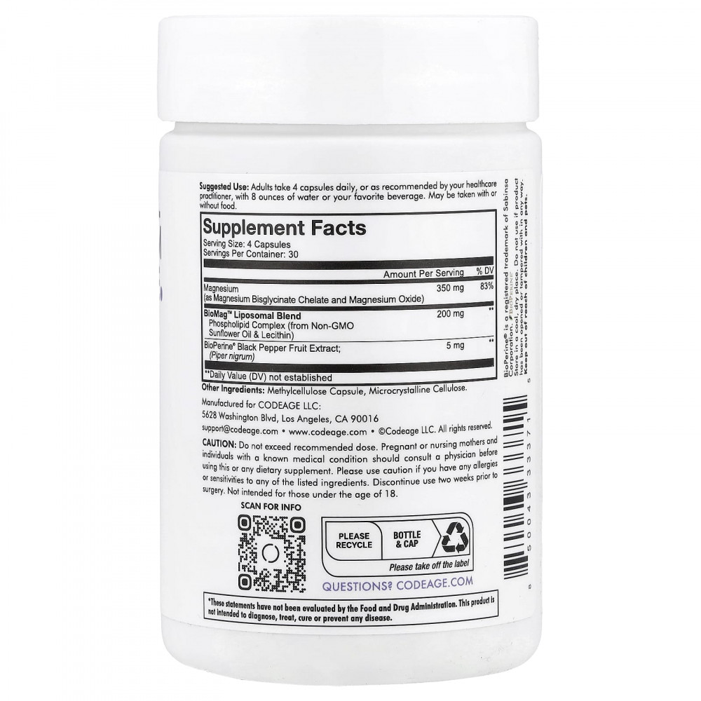 Добавка с липосомальным глицинатом магния от Codeage содержит 350 мг хелатного бисглицината магния в каждой порции.