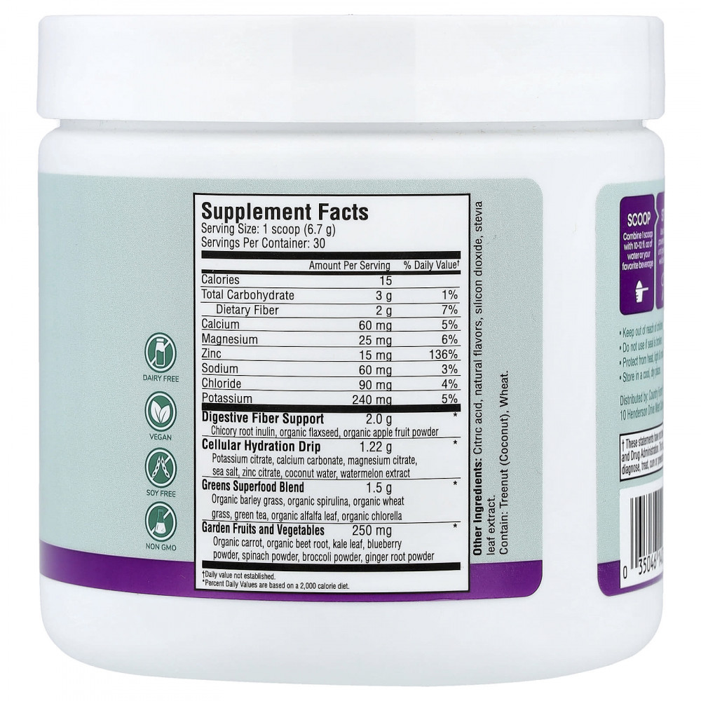 Помимо эффективного увлажнения, продукт Country Farms Refreshers содержит необходимую смесь зелени, фруктов, овощей и суперфудов в каждой порции. Просто смешайте 1 мерную ложку порошка Refreshers с водой, и вы получите полезные свойства органических ростков ячменя, спирулины, зеленого чая и ростков пшеницы, а также органической моркови и корнеплода свеклы. В состав также входит смесь клетчатки из корня цикория, органического льняного семени и органического яблока для улучшения пищеварения.