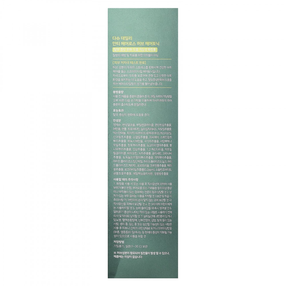 Это тоник в виде спрея для волос, содержащий растительные ингредиенты, которые снимают раздражение и стресс кожи головы, делая её здоровой. Он снижает чувствительность кожи головы и дарит ощущение свежести. Кроме того, он помогает облегчить симптомы выпадения волос, а также уменьшает повреждение волос и кожи головы перед укладкой или использованием фена.