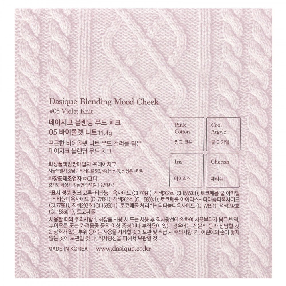 Прохладный Аргайл (1): Тальк, слюда (CI 77019), диоксид титана (CI 77891), полиметилметакрилат, оксид железа красный (CI 77491), лауроил лизин, CI 15850: 1, диметикон, октилдодецил стеароил стеарат, диизостеарил малат, изоцетил миристат, каприлил гликоль, гидрогенизированное пальмовое масло, гидрогенизированное рапсовое масло, глицерил каприлат, черный оксид железа (CI 77499), этилгексилглицерин, триэтоксикаприлилсилан, гидрогенизированный лецитин, токоферол.