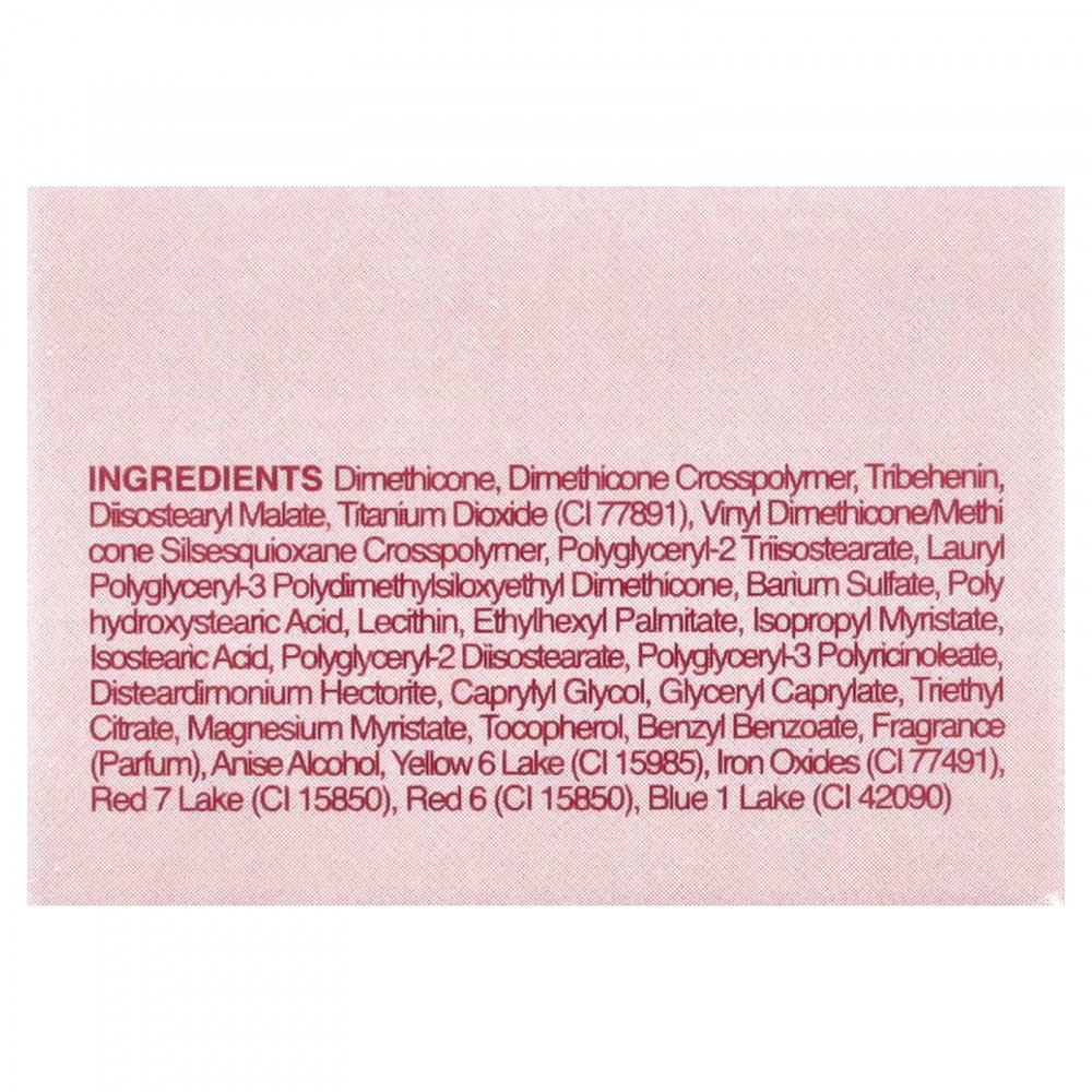 Диметикон, диметикон кроссполимер, трибехенин, дистеарил малат, диоксид титана (CI 77891), винил диметикон/метикон силсесквиоксан кроссполимер, полиглицерил-2 триизостеарат, лаурилполиглицерил-3-полидиметилсилоксиэтилдиметикон, сульфат бария, полигидроксистеариновая кислота, лецитин, этилгексил пальмитат, изопропил миристат, изостеариновая кислота, полиглицерил-2 диизостеарат, полиглицерил-3-полирицинолеат, дистеардимония гекторит, каприлилгликоль, глицерил каприлат, триэтилцитрат, миристат магния, токоферол, бензилбензоат, отдушка (парфюмерная композиция), анисовый спирт, краситель желтый 6 лак (CI 15985), оксиды железа (CI 77491), краситель красный 7 лак (CI 15850), краситель красный 6 (CI 15850), краситель синий 1 лак (CI 42090).