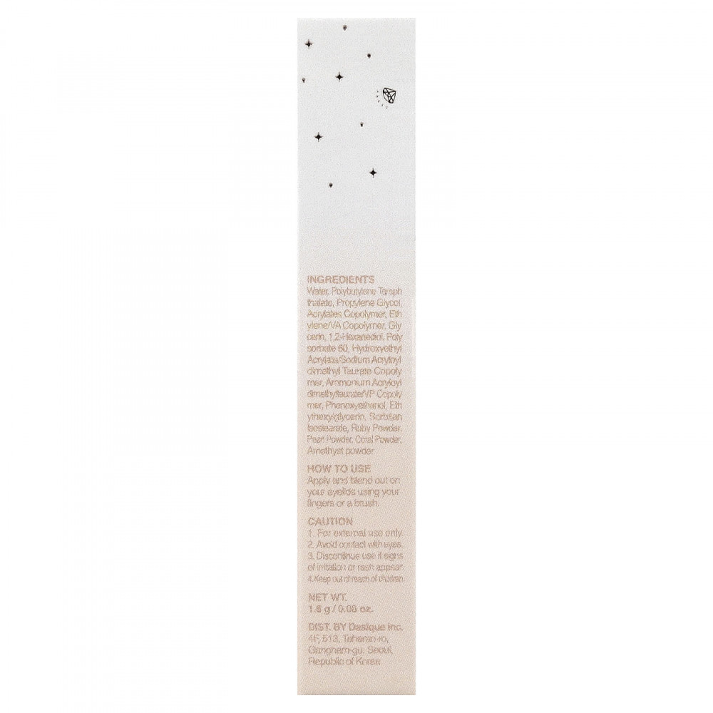 Вода, полибутилентерефталат, пропиленгликоль, сополимер акрилатов, сополимер этилена/ВА, глицерин, 1,2-гександиол, полисорбат 60, гидроксиэтил акрилат/натрия акрилоилдиметилтаурата сополимер, аммоний акрилоилдиметилтаурат/ВП сополимер, феноксиэтанол, этилгексилглицерин, сорбитан изостеарат, рубиновый порошок, жемчужный порошок, коралловый порошок, аметистовый порошок.