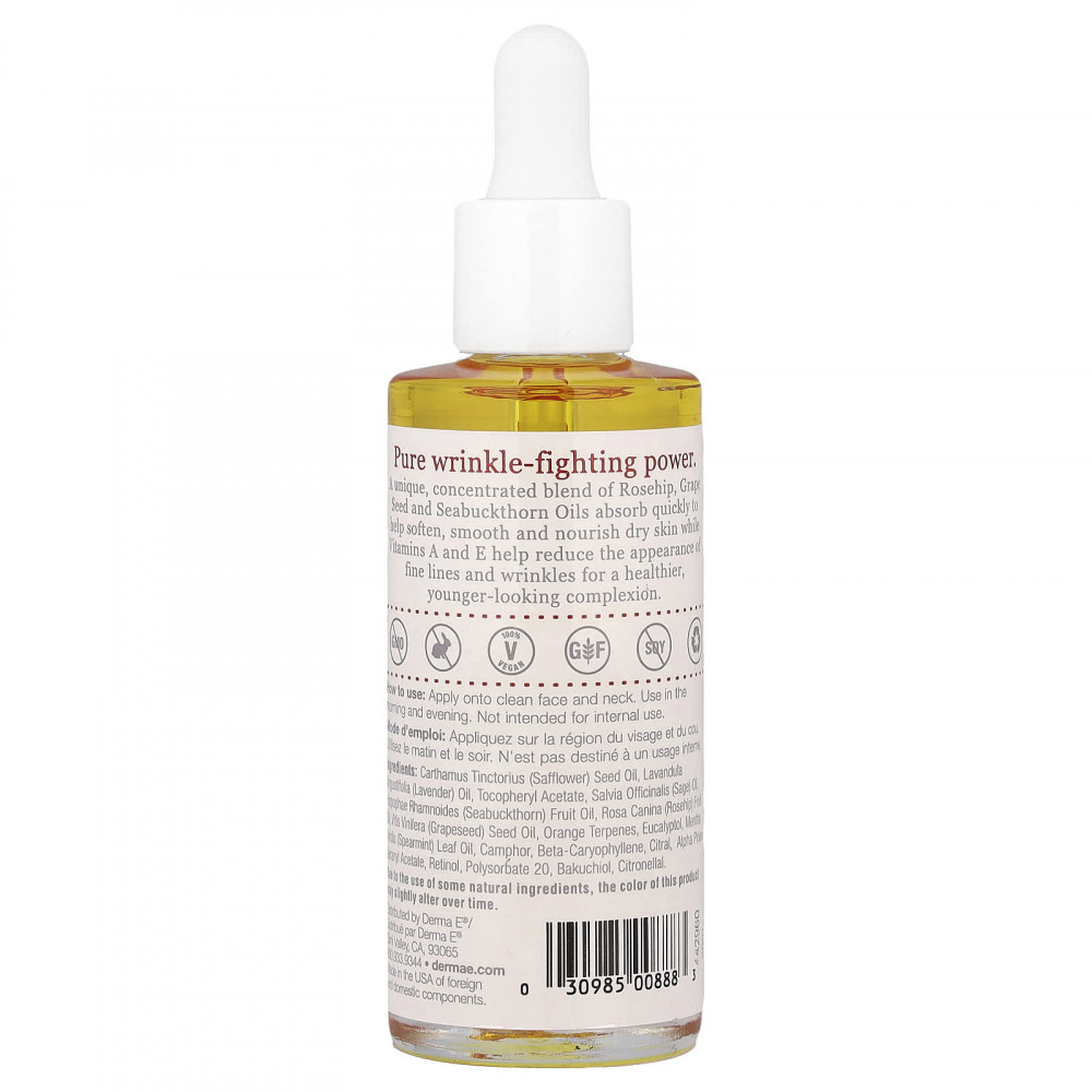 Уникальная концентрированная смесь масел шиповника, виноградных косточек и облепихи быстро впитывается, смягчая, разглаживая и питая сухую кожу, а витамины А и Е помогают уменьшить мелкие и глубокие морщины, делая кожу более здоровой и молодой.