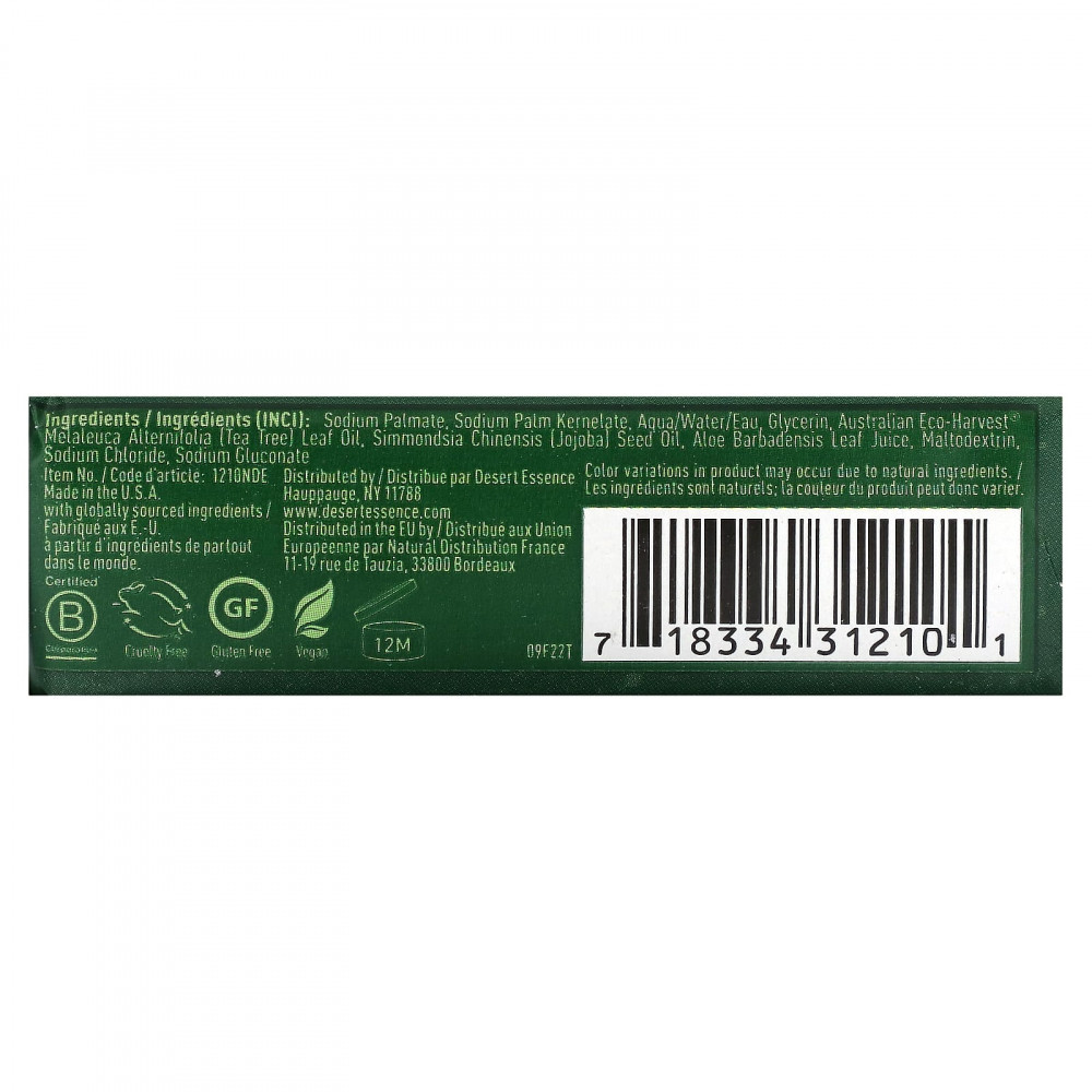 Пальмитат натрия, пальмовый кернелат натрия, вода, глицерин, масло из листьев чайного дерева (Melaleuca alternifolia) от Australia Eco-Harvest®, масло из семян жожоба (Simmondsia chinensis), сок из листьев алоэ вера (Aloe barbadensis), мальтодекстрин, хлорид натрия, глюконат натрия.