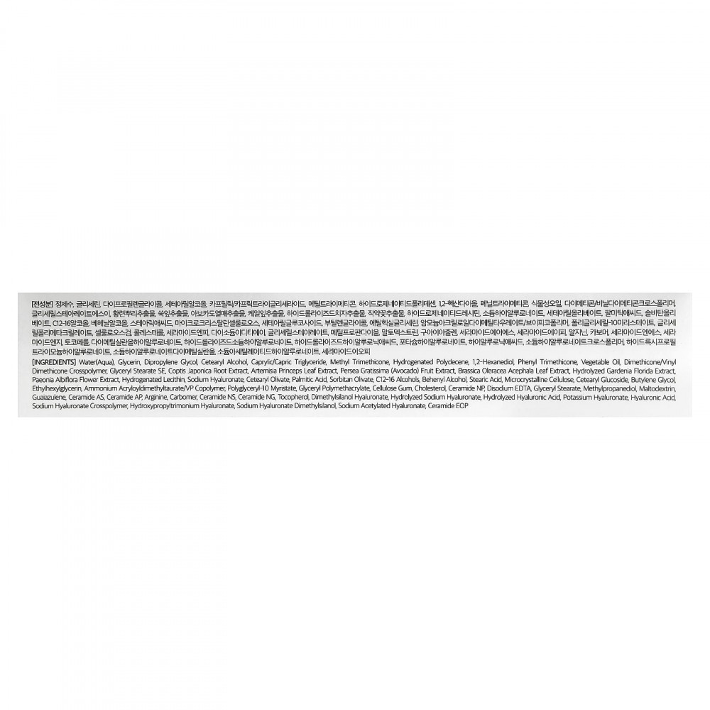 Вода (Aqua), глицерин, дипропиленгликоль, цетеариловый спирт, каприловый/каприновый триглицерид, метилтриметикон, гидрогенизированный полидецен, 1,2-гександиол, фенилтриметикон, растительное масло, диметикон/винил диметикон кроссполимер, глицерил стеарат эмульгирующий, экстракт корня коптиса японского (Coptis japonica), экстракт листьев полыни корейской (Artemisia princeps), экстракт плодов авокадо (Persea gratissima), экстракт листьев кудрявой капусты (Brassica oleracea acephala), гидролизованный экстракт гардении жасминовидной (Gardenia florida), экстракт цветков пиона молочноцветкового (Paeonia albiflora), гидрогенизированный лецитин, гиалуронат натрия, цетеарил оливат, пальмитиновая кислота, сорбитан оливат, c12-16 спирты, бегениловый спирт, стеариновая кислота, микрокристаллическая целлюлоза, цетеариловый глюкозид, бутиленгликоль, этилгексилглицерин, аммоний акрилоилдиметилтаурат/ВП сополимер, полиглицерил-10 миристат, глицерил полиметакрилат, целлюлозная камедь, холестерина, керамид NP, двунатриевая ЭДТК, глицерил стеарат, метилпропандиол, мальтодекстрин, гвайазулен, керамид AS, керамид АP, аргинин, карбомер, керамид NS, керамид нг, токоферол, диметилсиланол гиалуронат, гидролизованный гиалуронат натрия, гидролизованная гиалуроновая кислота, гиалуронат калия, гиалуроновая кислота, кроссполимер гиалуроната натрия, гиалуронат гидроксипропилтримония, гиалуронат натрия диметилсиланол, ацетилированный гиалуронат натрия, керамид EOP.