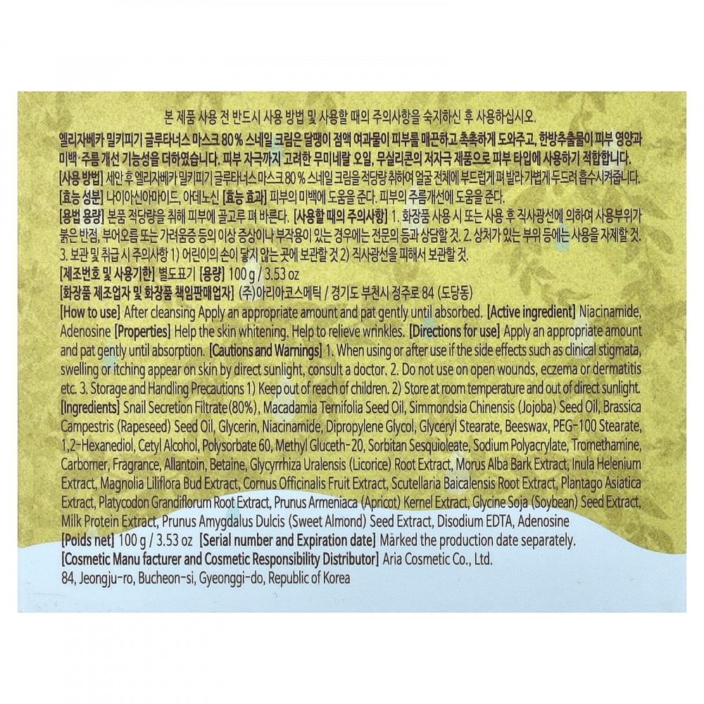 Фильтрат секрета улитки (80%), масло макадамии (Macadamia ternifolia), масло из семян жожоба (Simmondsia chinensis), рапсовое масло (Brassica campestris), глицерин, никотинамид, дипропиленгликоль, глицерил стеарат, пчелиный воск, ПЭГ-100 стеарат, 1,2-гександиол, цетиловый спирт, полисорбат 60, метил глюцет-20, сорбитана сесквиолеат, полиакрилат натрия, трометамин, карбомер, отдушка, аллантоин, бетаин, экстракт корня солодки уральской (Glycyrrhiza uralensis), экстракт коры шелковицы белой (Morus alba), экстракт девясила гелениевого (Inula helenium), экстракт бутонов магнолии лилифлоры (Magnolia liliflora), экстракт плодов кизила лекарственного (Cornus officinalis), экстракт корня шлемника (Scutellaria baicalensis), экстракт подорожника азиатского (Plantago asiatica), экстракт корня платикодона крупноцветкового (Platycodon grandiflorum), экстракт косточек абрикоса (Prunus armeniaca), экстракт соевых бобов (Glycine soja), экстракт молочного белка, экстракт семян сладкого миндаля (Prunus amygdalus dulcis), двунатриевая ЭДТК, аденозин.