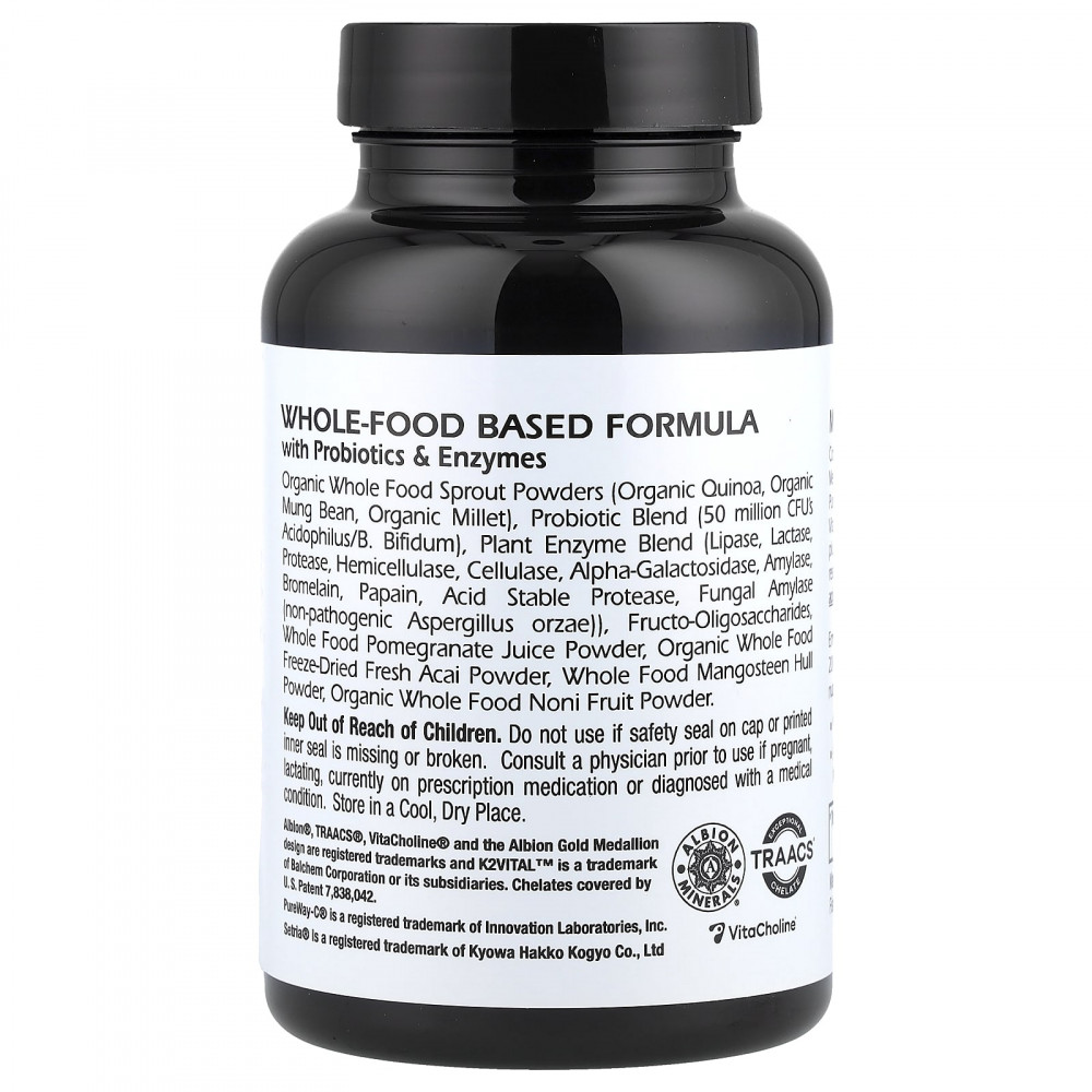 Порошки из органических цельных ростков (органическое киноа, органический маш, органическое просо), смесь пробиотиков (50 млн КОЕ ацидофилус/бифидобактерии бифидум (Bifidobacterium bifidum), смесь растительных ферментов (липаза, лактаза, протеаза, гемицеллюлаза, целлюлаза, альфа-галактозидаза, амилаза, бромелаин, папаин, кислотостойкая протеаза, грибковая амилаза (непатогенный аспергилл (Aspergillus orzae)), фруктоолигосахариды, порошок из цельнопищевого гранатового сока, органические сублимированные свежие порошки асаи из цельных продуктов, порошок из цельной шелухи гарцинии, органический порошок из цельных плодов нони.