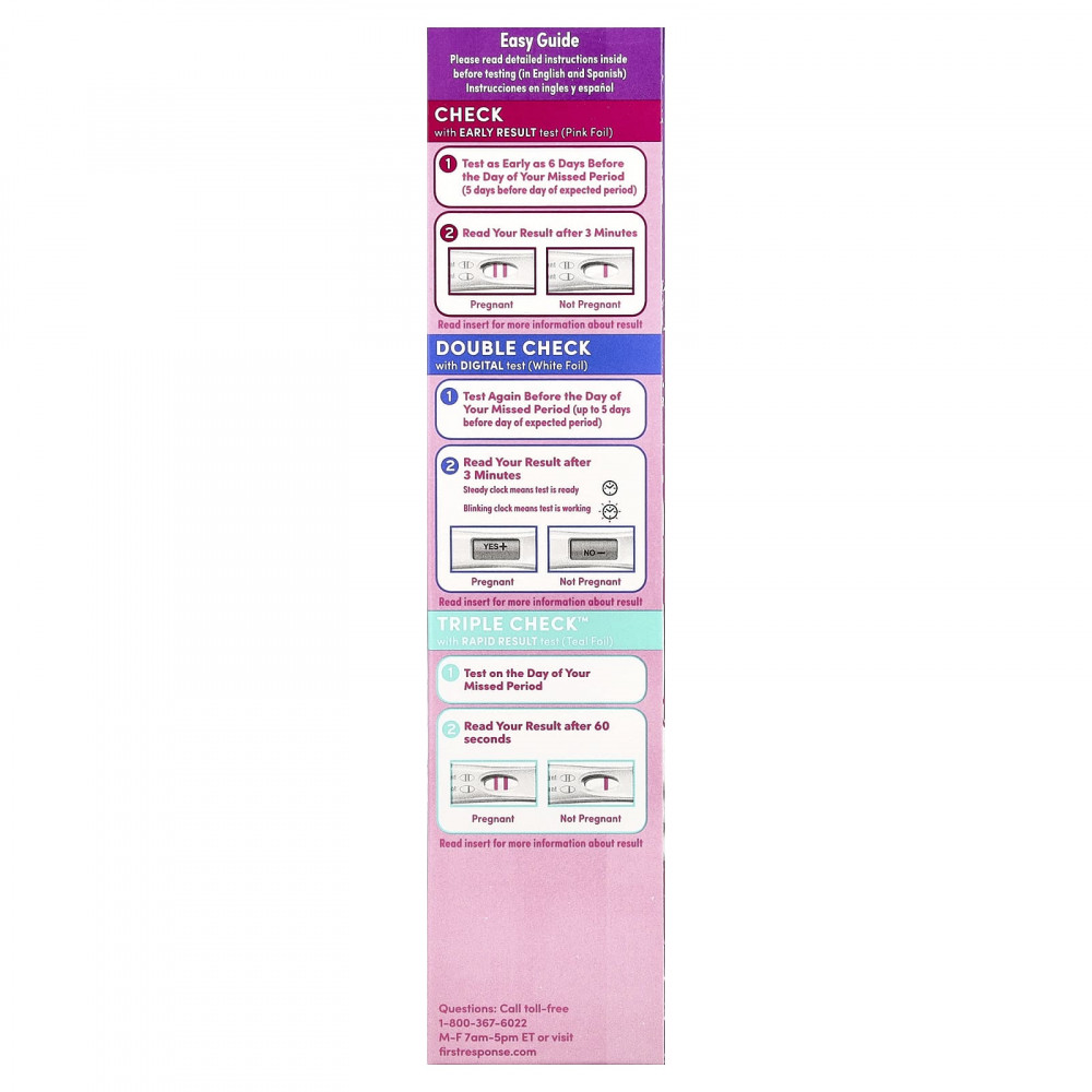 Что нужно знать о преждевременном тестировании... У некоторых беременных женщин в день использования теста в моче может не обнаружиться гормон беременности. Количество гормона беременности увеличивается с течением времени. В ходе лабораторных исследований тест на беременность с ранними результатами First Response™ определил уровень гормонов беременности у 76% беременных женщин за 5 дней до ожидаемой менструации и у 96% беременных женщин за 4 дня до ожидаемой менструации в >99% беременных женщин за 3 дня до ожидаемой менструации в >99% беременных женщин за 2 дня до ожидаемой менструации в >99% беременных женщин за 1 день до ожидаемой менструации и в >99% беременных женщин в день ожидаемой менструации. В ходе лабораторных исследований цифровой тест на беременность First Response™ определил уровень гормонов беременности у 60% беременных женщин за 5 дней до ожидаемой менструации, у 86% беременных женщин за 4 дня до ожидаемой менструации и у 96% беременных женщин за 3 дня до ожидаемого периода — через >99% беременных женщин за 2 дня до ожидаемой менструации в >99% беременных женщин за 1 день до ожидаемой менструации и в >99% беременных женщин в день ожидаемой менструации.